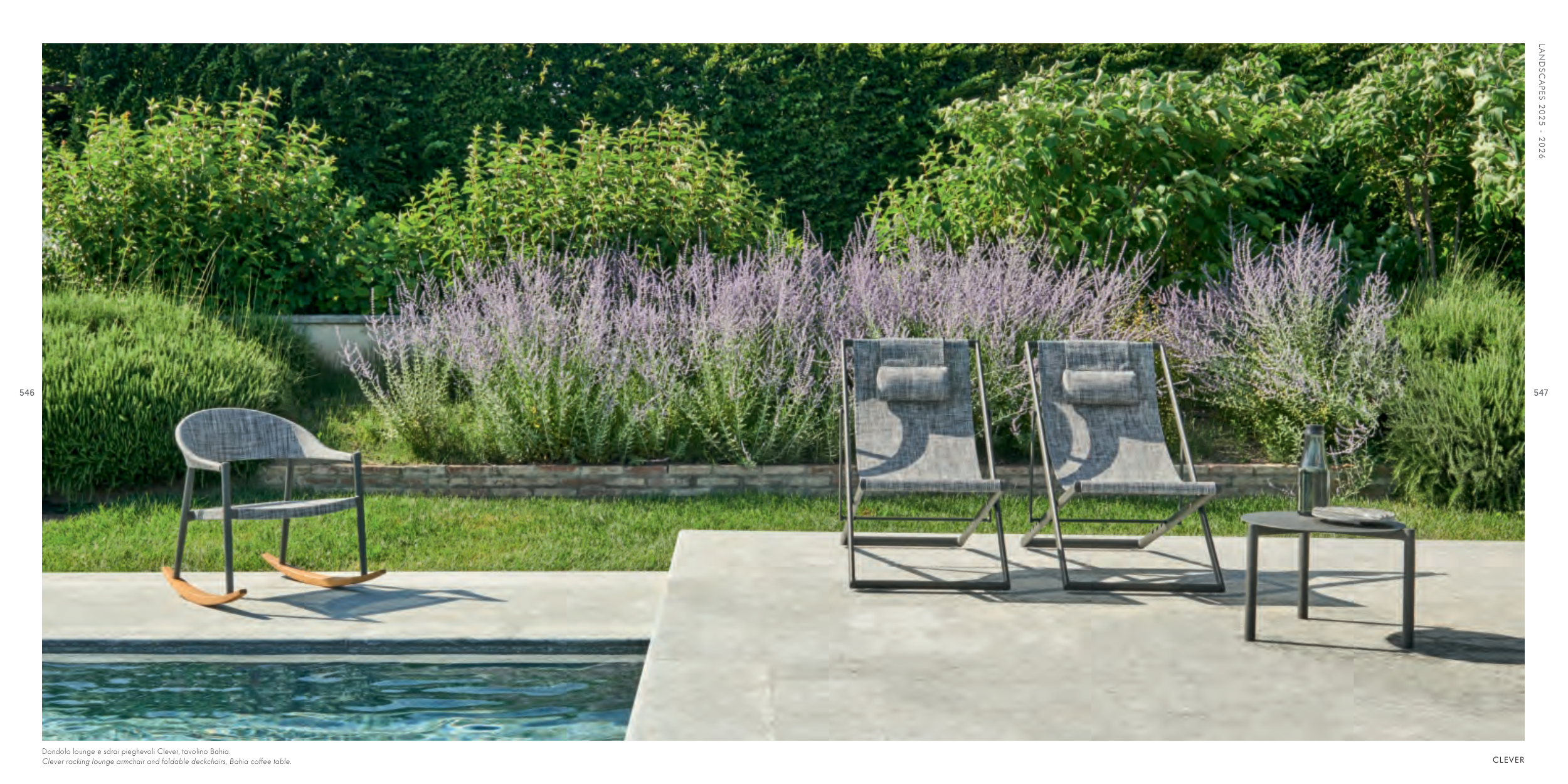 Clever rocking lounge armchair and foldable deckchairs, Bahia coffee table.