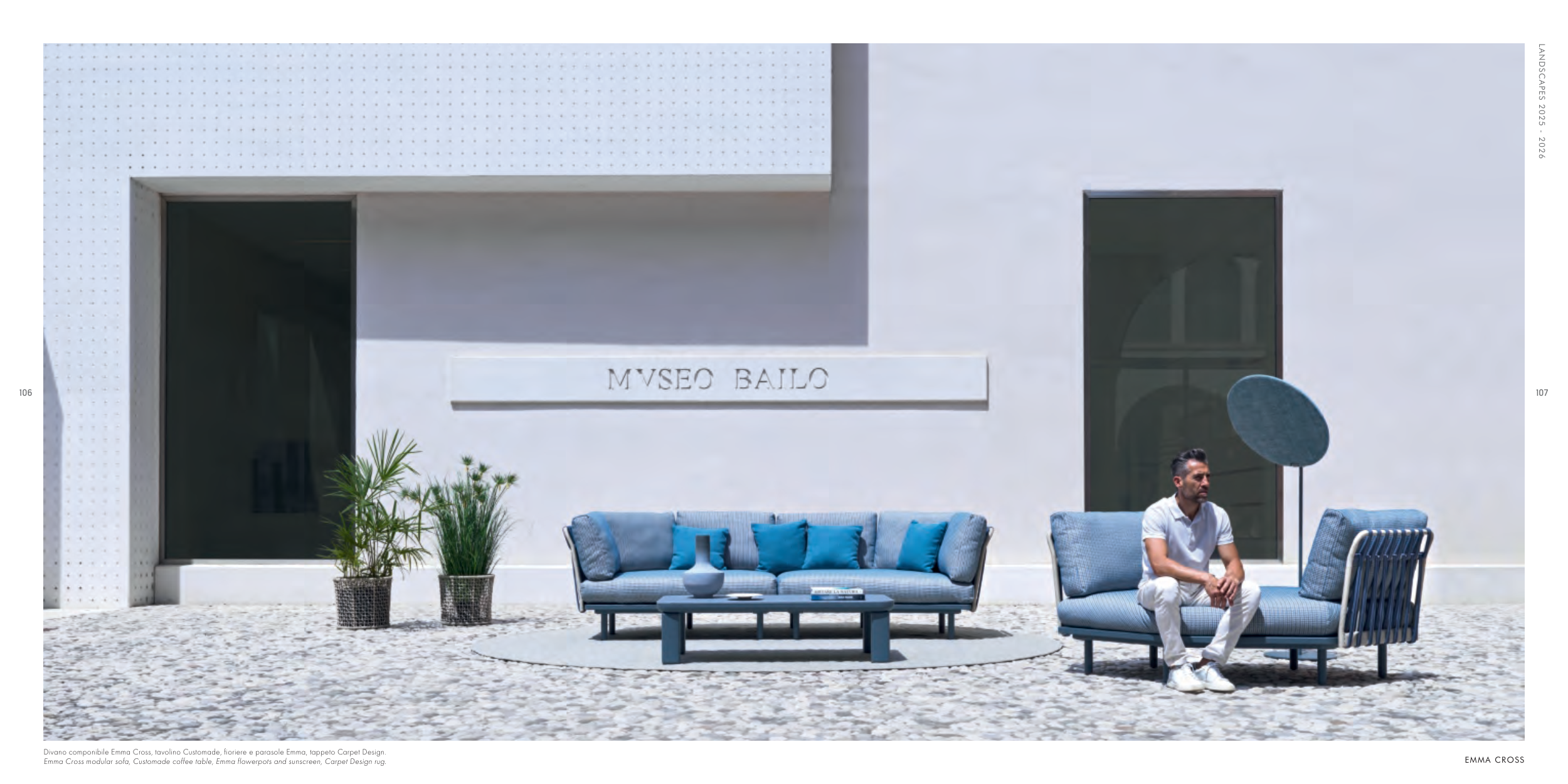 Divano componibile Emma Cross, tavolino Customade, fioriere e parasole Emma, tappeto Carpet Design.