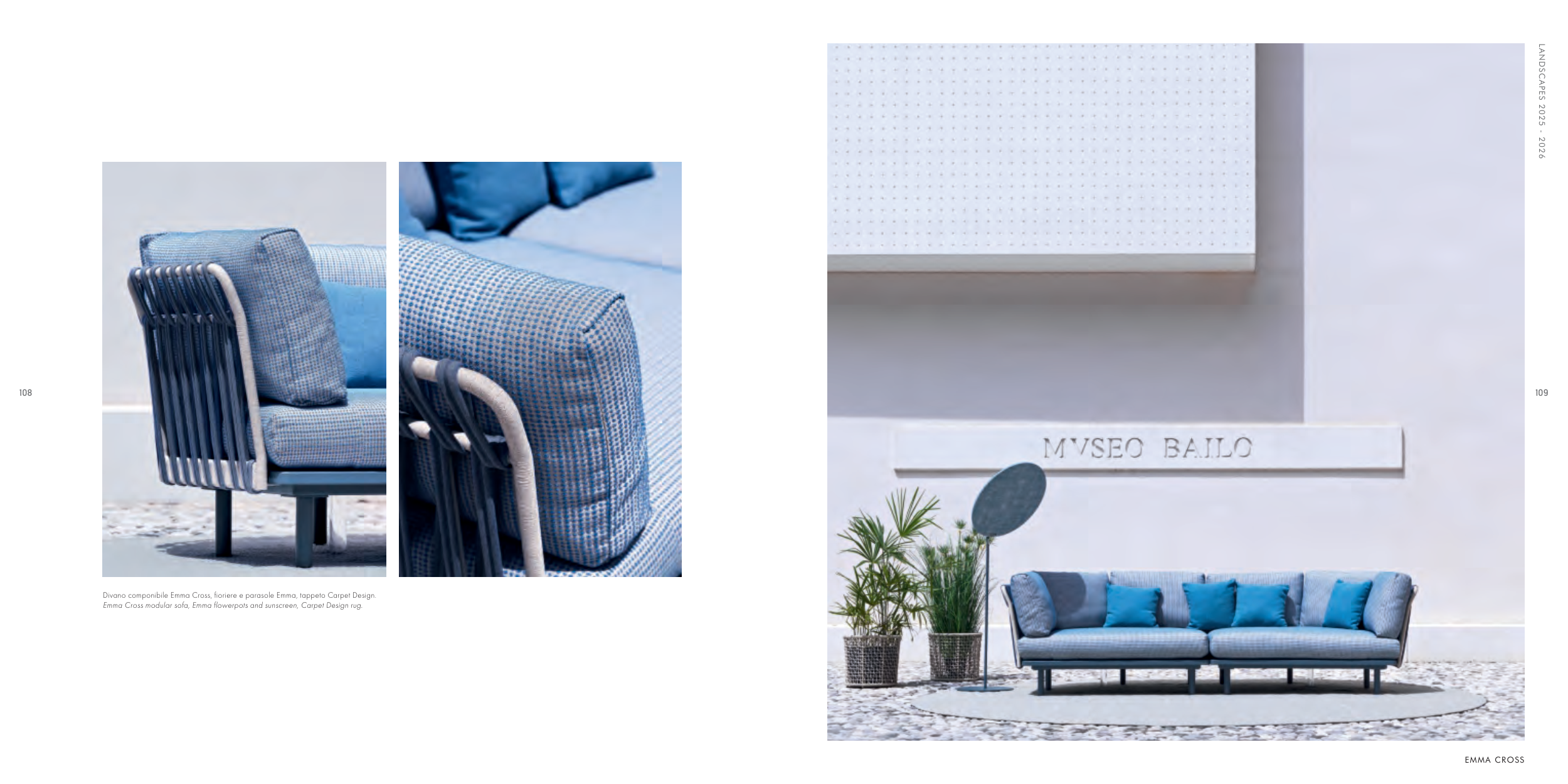 LANDSCAPES 2025 - 2026 108 109 Divano componibile Emma Cross, fioriere e parasole Emma, tappeto Carpet Design. Emma Cross modular sofa, Emma flowerpots and sunscreen, Carpet Design rug. EMMA CROSS