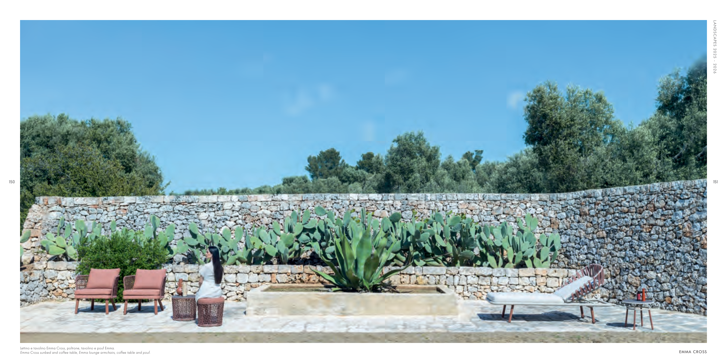 LANDSCAPES 2025 - 2026 150 151 Lettino e tavolino Emma Cross, poltrone, tavolino e pouf Emma. Emma Cross sunbed and coffee table, Emma lounge armchairs, coffee table and pouf. EMMA CROSS