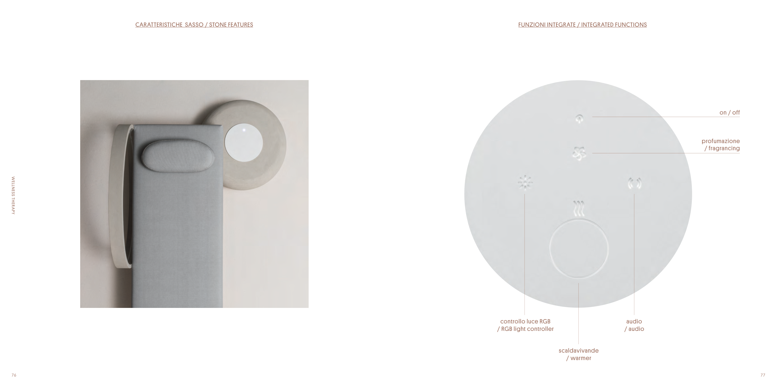 77 WELLNESS THERAPY 76 CARATTERISTICHE SASSO / STONE FEATURES FUNZIONI INTEGRATE / INTEGRATED FUNCTIONS on / off profumazione / fragrancing audio / audio controllo luce RGB / RGB light controller scaldavivande / warmer