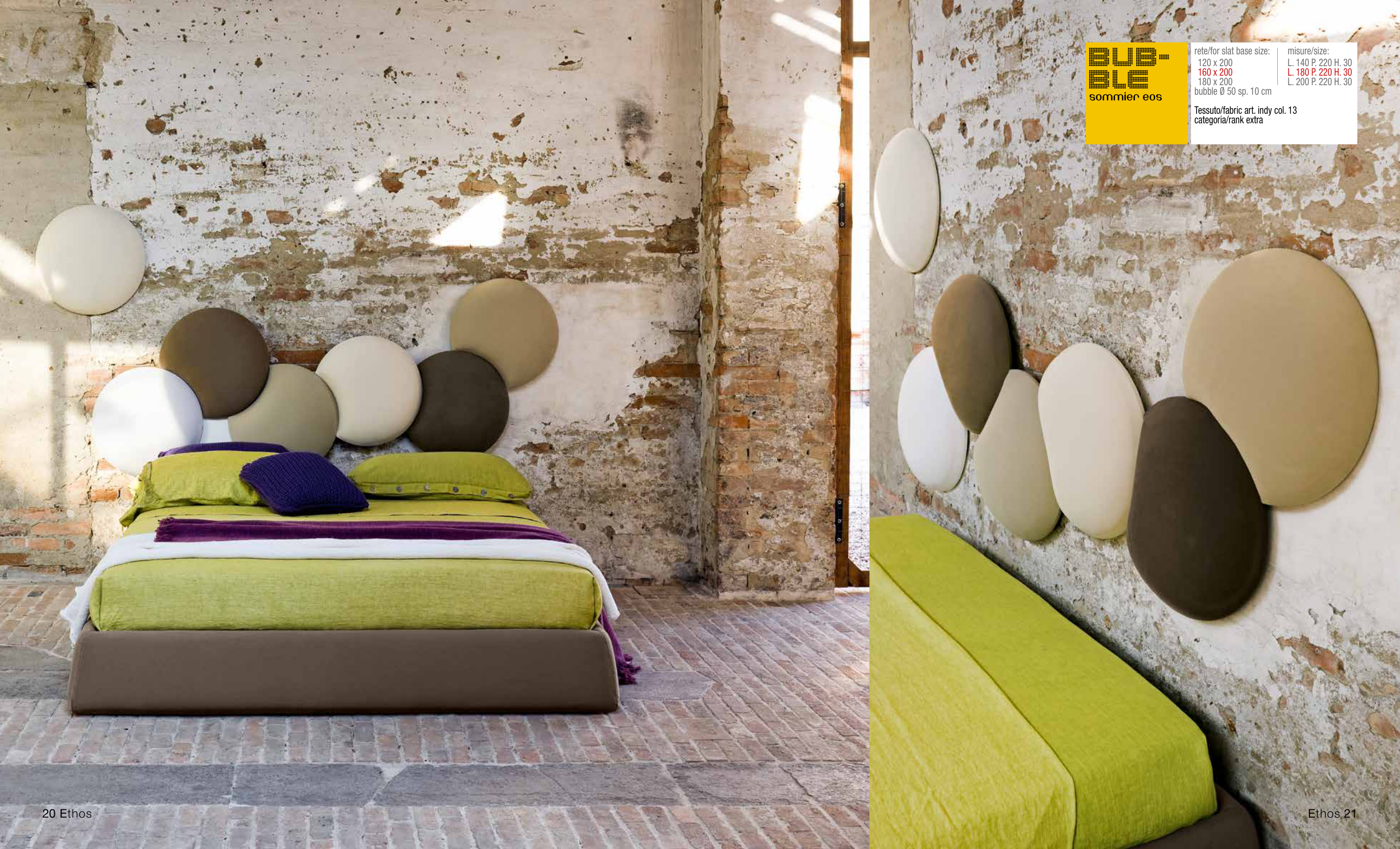 Ethos 21 20 Ethos BUB- BLE sommier eos rete/for slat base size: misure/size: 120 x 200 L. 140 P. 220 H. 30 160 x 200 L. 180 P. 220 H. 30 180 x 200 L. 200 P. 220 H. 30 bubble Ø 50 sp. 10 cm Tessuto/fabric art. indy col. 13 categoria/rank extra