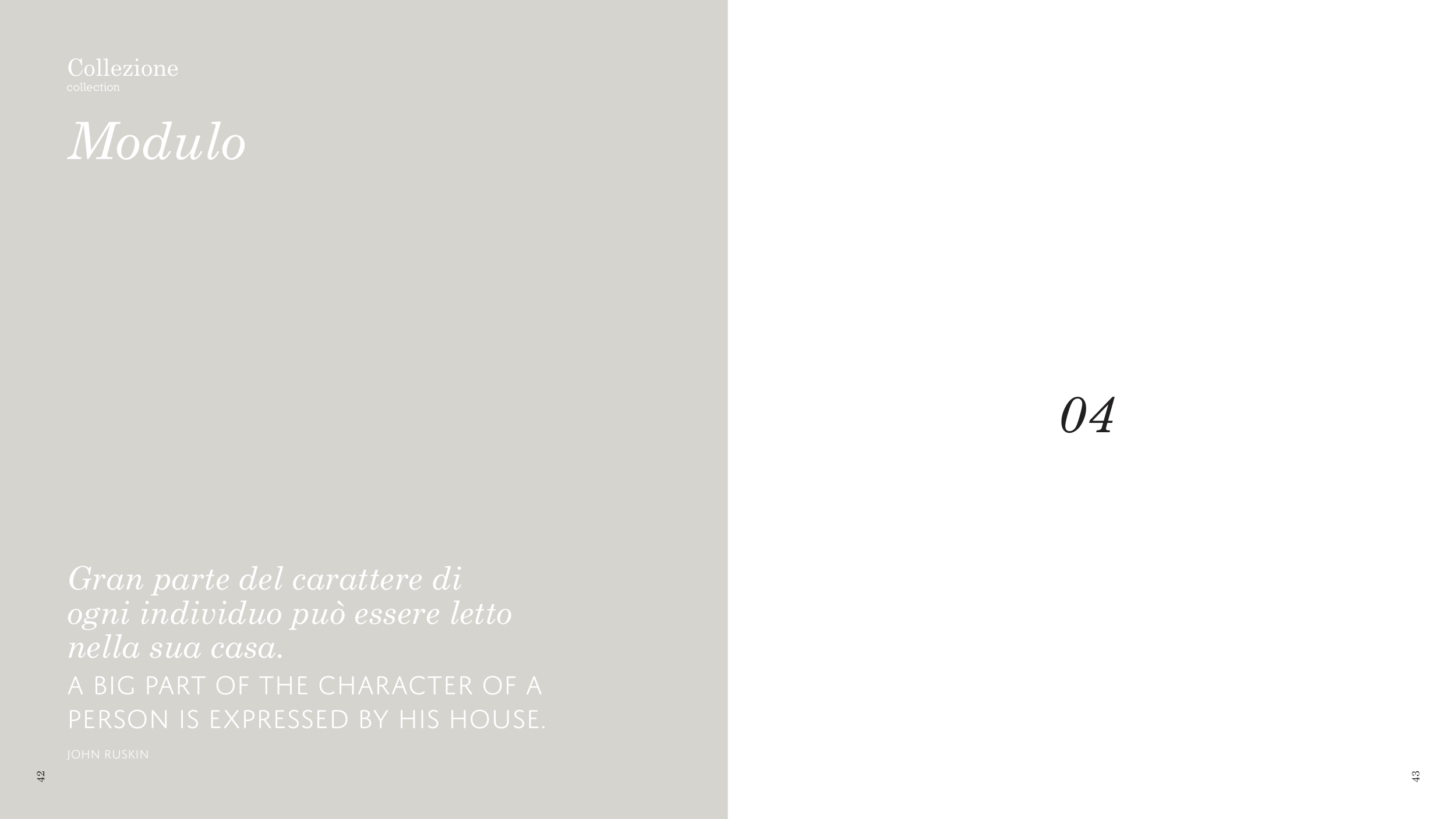 Collezione collection Modulo 04 Gran parte del carattere di ogni individuo può essere letto nella sua casa. A big part of the character of a person is expressed by his house. John Ruskin 42 43