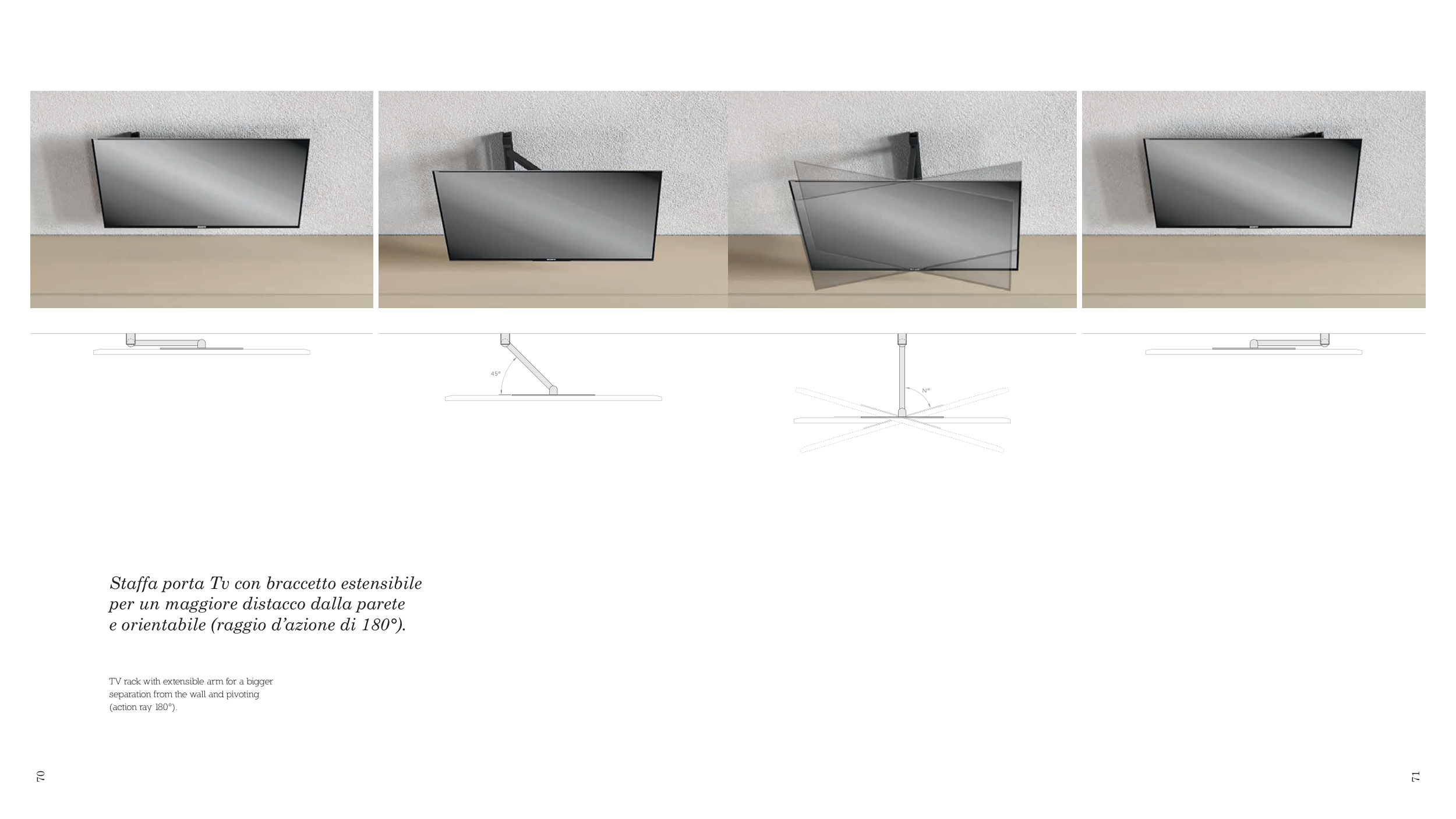 45° n° Staffa porta Tv con braccetto estensibile per un maggiore distacco dalla parete e orientabile (raggio d’azione di 180°). TV rack with extensible arm for a bigger separation from the wall and pivoting (action ray 180°). 70 71