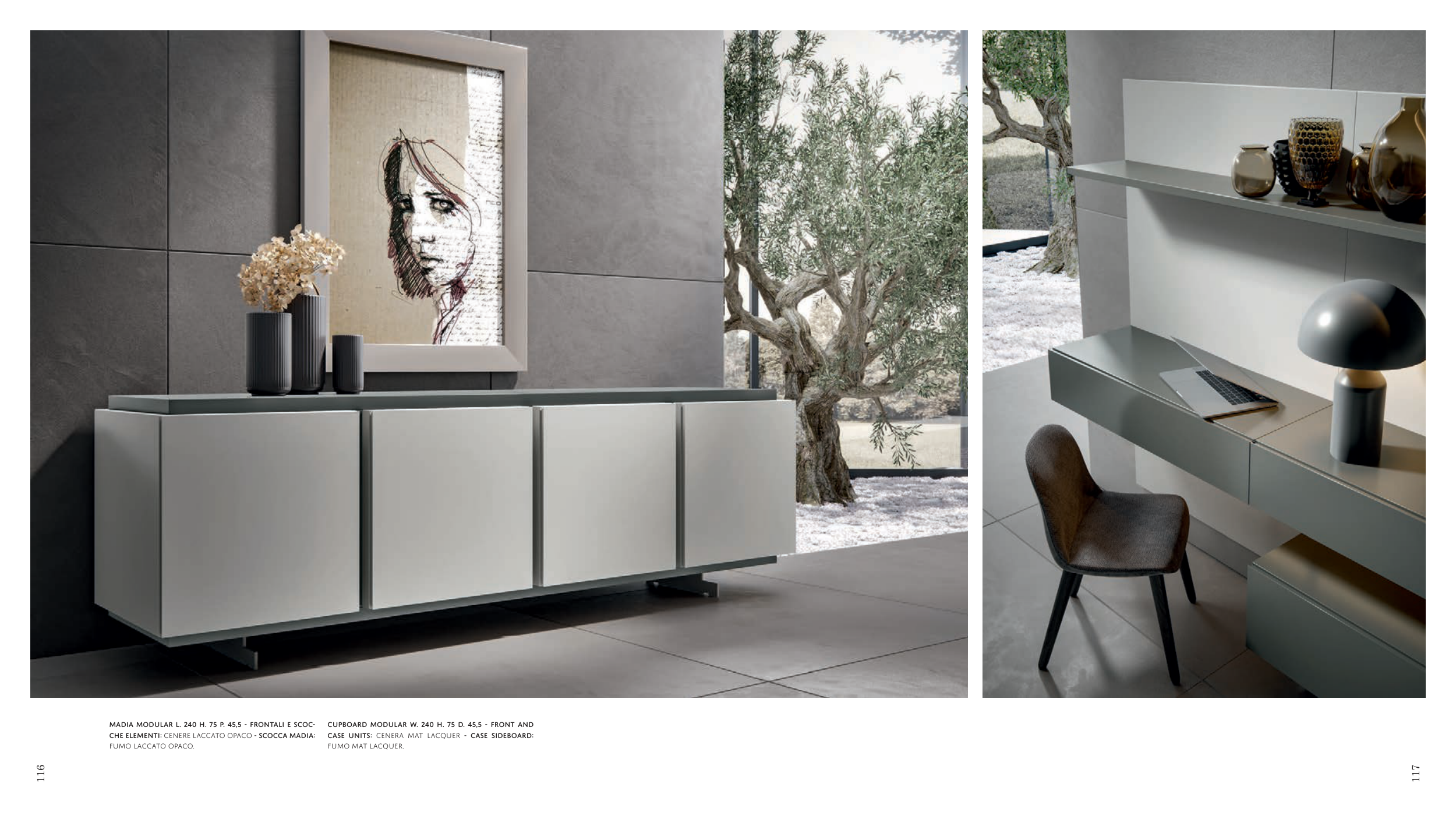 Madia Modular L. 240 H. 75 P. 45,5 - frontali e scoc- che elementi: cenere laccato opaco - scocca madia: fumo laccato opaco. CUPBOARD MODULAR W. 240 H. 75 D. 45,5 - FRONT AND CASE UNITS: CENERA MAT LACQUER - CASE SIDEBOARD: FUMO MAT LACQUER. 116 117