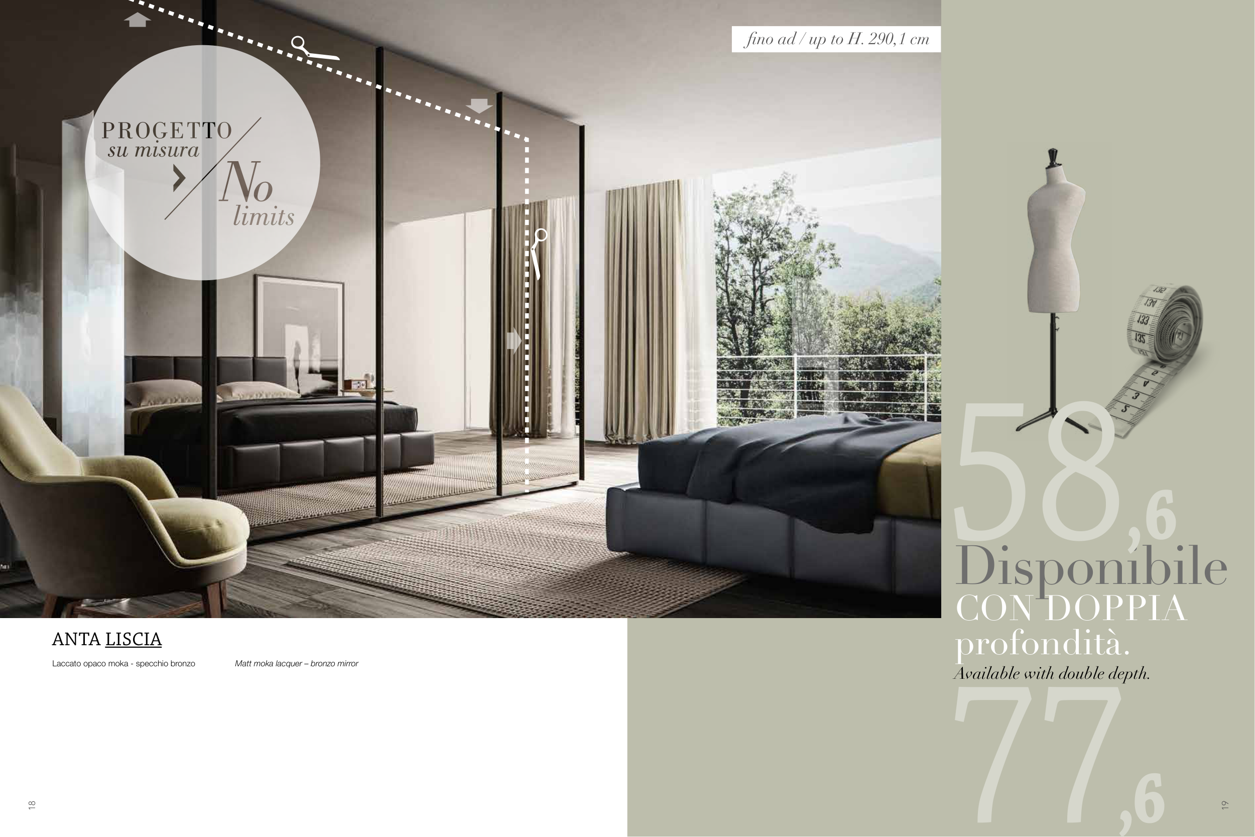 Laccato opaco moka - specchio bronzo Matt moka lacquer – bronzo mirror ANTA LISCIA fino ad / up to H. 290,1 cm 19 18 Disponibile CON DOPPIA profondità. Available with double depth.
