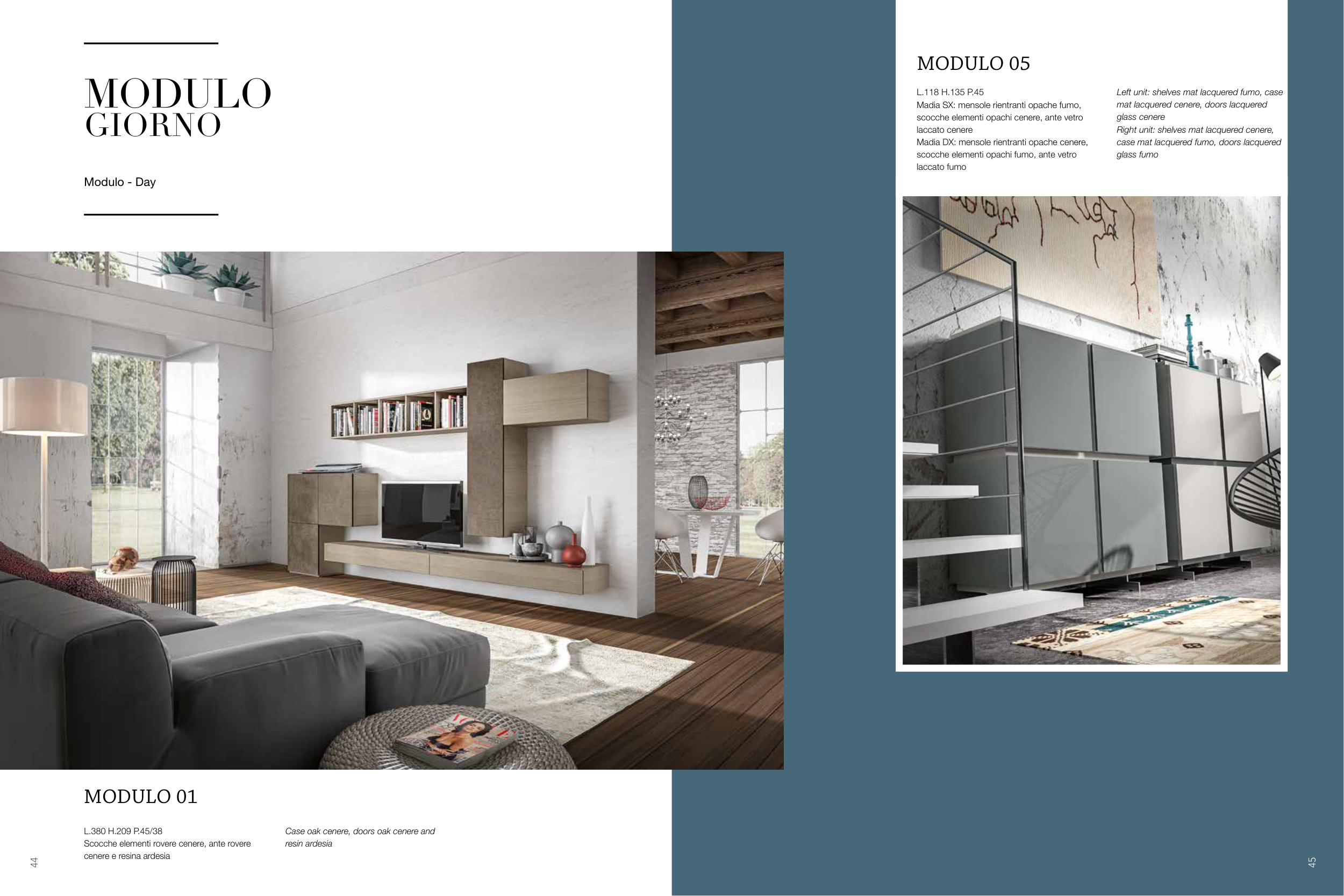 Right unit: shelves mat lacquered cenere,