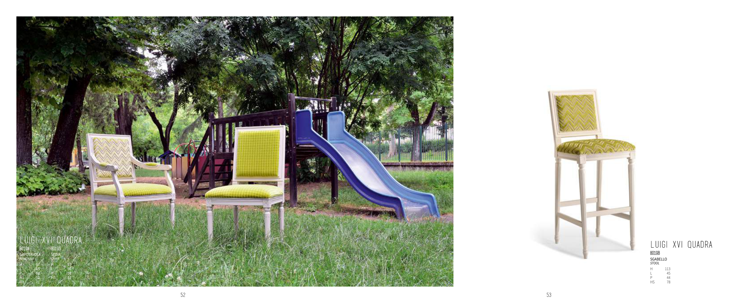 53 52 LUIGI XVI QUADRA 8019A 8019S CAPOTAvOLA armchair SeDIA chair H 97 H 97 L 65 L 50 P 63 P 58 HS 52 HS 52 HB 71 LUIGI XVI QUADRA 8019B SGABeLLO sTOOL H 113 L 45 P 44 HS 78