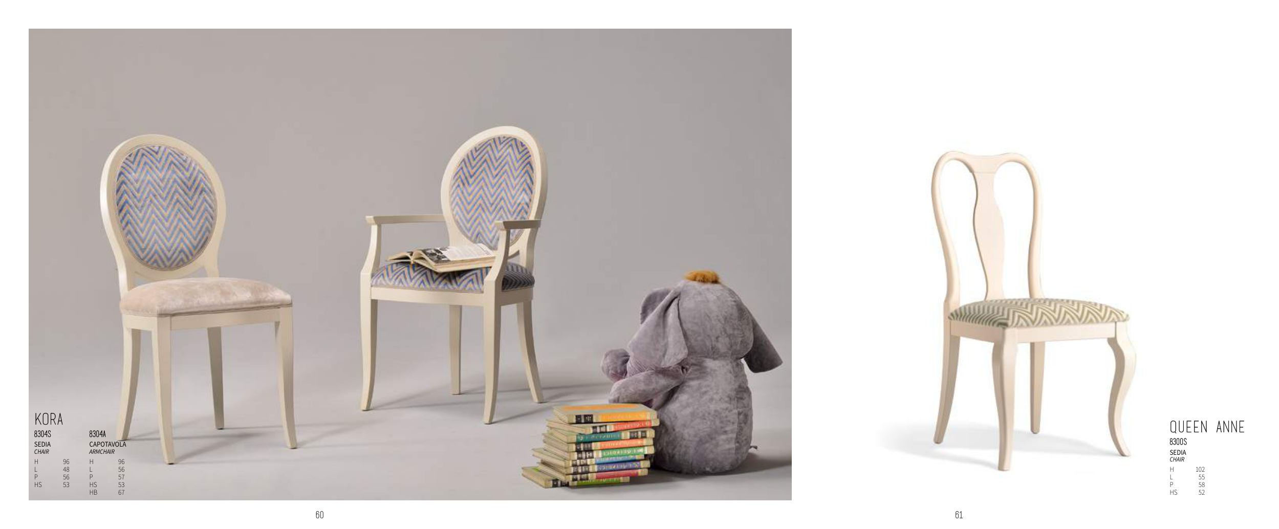 61 60 QUEEN ANNE 8300S SeDIA chair H 102 L 55 P 58 HS 52 KORA 8304S 8304A SeDIA chair CAPOTAvOLA armchair H 96 H 96 L 48 L 56 P 56 P 57 HS 53 HS 53 HB 67