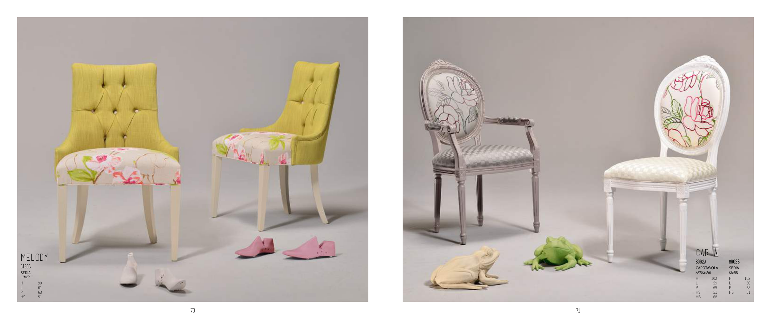 71 70 MELODY 8198S SeDIA chair H 90 L 61 P 63 HS 51 CARLA 8662A 8662S CAPOTAvOLA armchair SeDIA chair H 102 H 102 L 59 L 50 P 65 P 58 HS 51 HS 51 HB 68