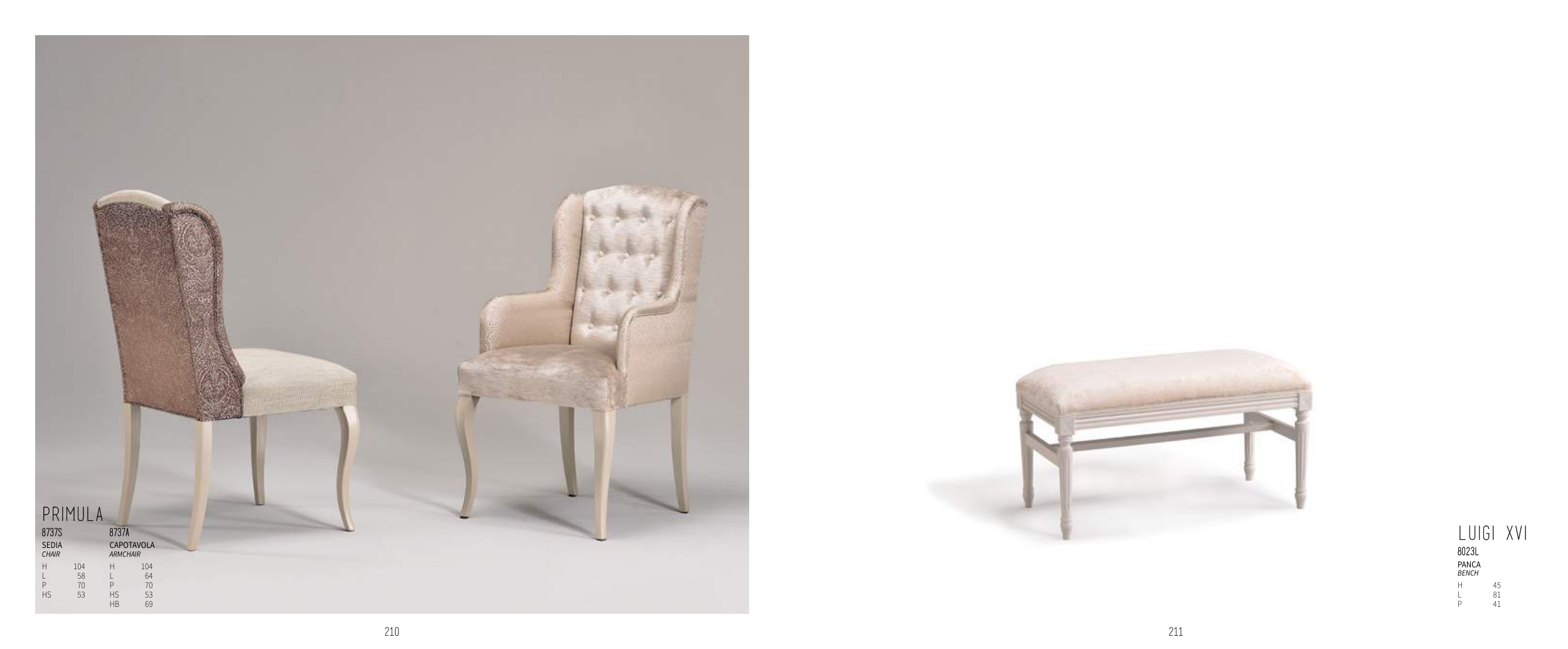 211 210 PRIMULA 8737S 8737A SEDIA chAir CAPOTAVOLA ArmchAir H 104 H 104 L 58 L 64 P 70 P 70 HS 53 HS 53 HB 69 LUIGI XVI 8023L PANCA bench H 45 L 81 P 41