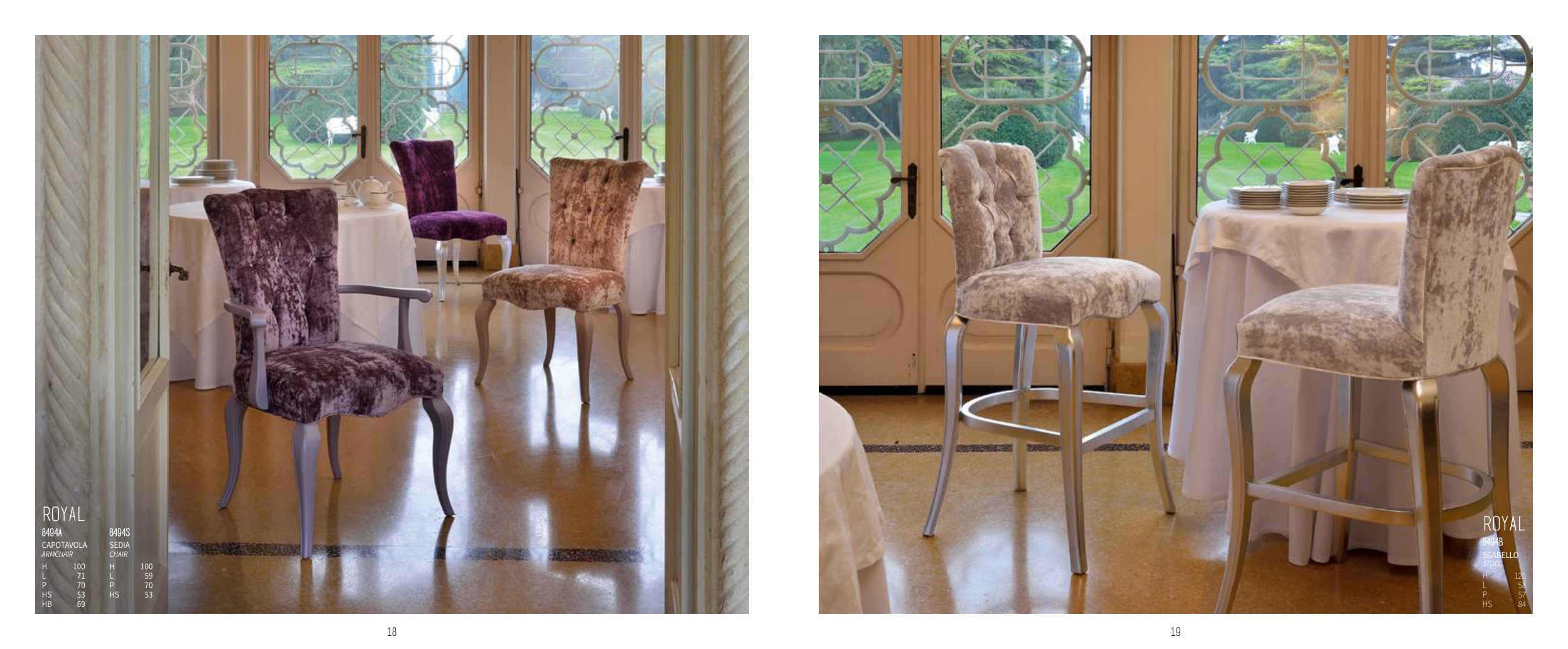 19 18 ROYAL 8494A 8494S CAPOTAVOLA ArmchAir SEDIA chAir H 100 H 100 L 71 L 59 P 70 P 70 HS 53 HS 53 HB 69 ROYAL 8494B SGABELLO StOOL H 120 L 58 P 57 HS 84