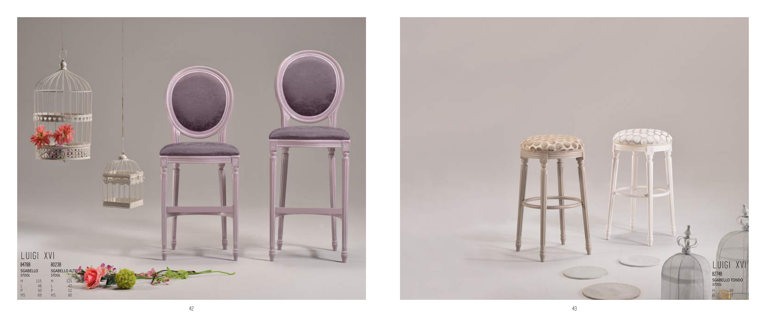43 42 LUIGI XVI 8479B 8023B SGABELLO StOOL SGABELLO ALTO StOOL H 115 H 125 L 48 L 47 P 50 P 52 HS 69 HS 80 LUIGI XVI 8274B SGABELLO TONDO StOOL H 69 Ø 37