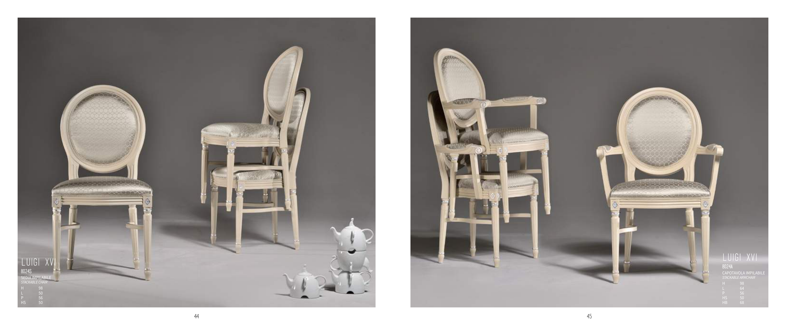 45 44 LUIGI XVI 8024A CAPOTAVOLA IMPILABILE StAckAbLe ArmchAir H 98 L 64 P 56 HS 50 HB 68 LUIGI XVI 8024S SEDIA IMPILABILE StAckAbLe chAir H 98 L 50 P 56 HS 50