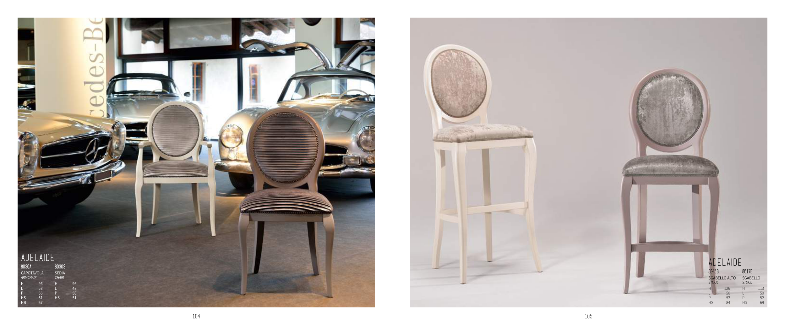 105 104 ADELAIDE 8030A 8030S CAPOTAVOLA ArmchAir SEDIA chAir H 96 H 96 L 58 L 48 P 56 P 56 HS 51 HS 51 HB 67 ADELAIDE 8845B 8617B SGABELLO ALTO StOOL SGABELLO StOOL H 126 H 113 L 50 L 50 P 52 P 52 HS 84 HS 69