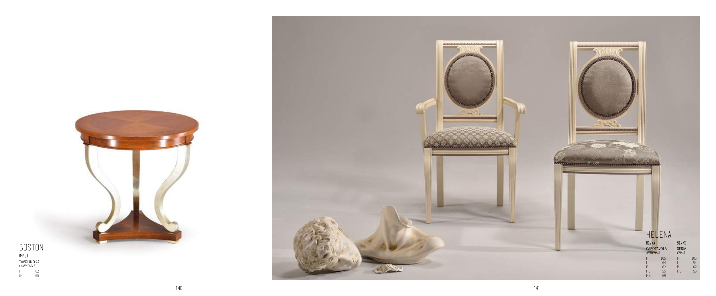 141 140 BOSTON 8449T TAVOLINO LAmP tAbLe H 62 Ø 65 HELENA 8177A 8177S CAPOTAVOLA ArmchAir SEDIA chAir H 105 H 105 L 64 L 54 P 62 P 62 HS 55 HS 55 HB 69