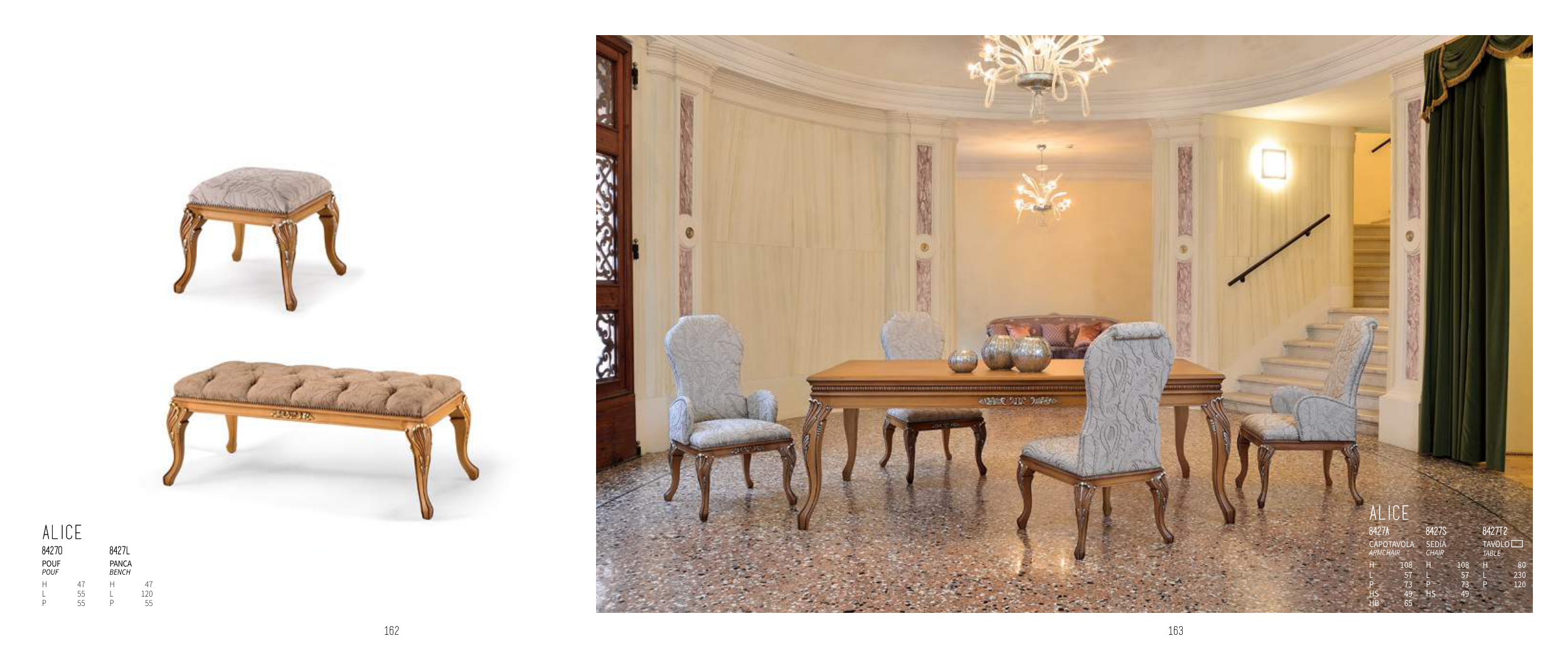 163 162 ALICE 8427O 8427L POUF POUF PANCA bench H 47 H 47 L 55 L 120 P 55 P 55 ALICE 8427A 8427S 8427T2 CAPOTAVOLA ArmchAir SEDIA chAir TAVOLO tAbLe H 108 H 108 H 80 L 57 L 57 L 230 P 73 P 73 P 120 HS 49 HS 49 HB 65