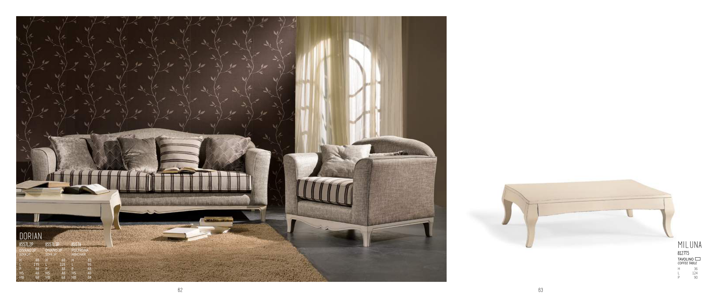 63 62 MILUNA 8127T5 TAVOLINO COFFEE TABLE H 36 L 124 P 90 DORIAN 8557L2P 8557L3P 8557A DIVANO 2P SOFA 2P DIVANO 3P SOFA 3P POLTRONA ARmCHAIR H 88 H 88 H 83 L 175 L 228 L 95 P 88 P 88 P 88 HS 48 HS 48 HS 48 HB 68 HB 68 HB 68