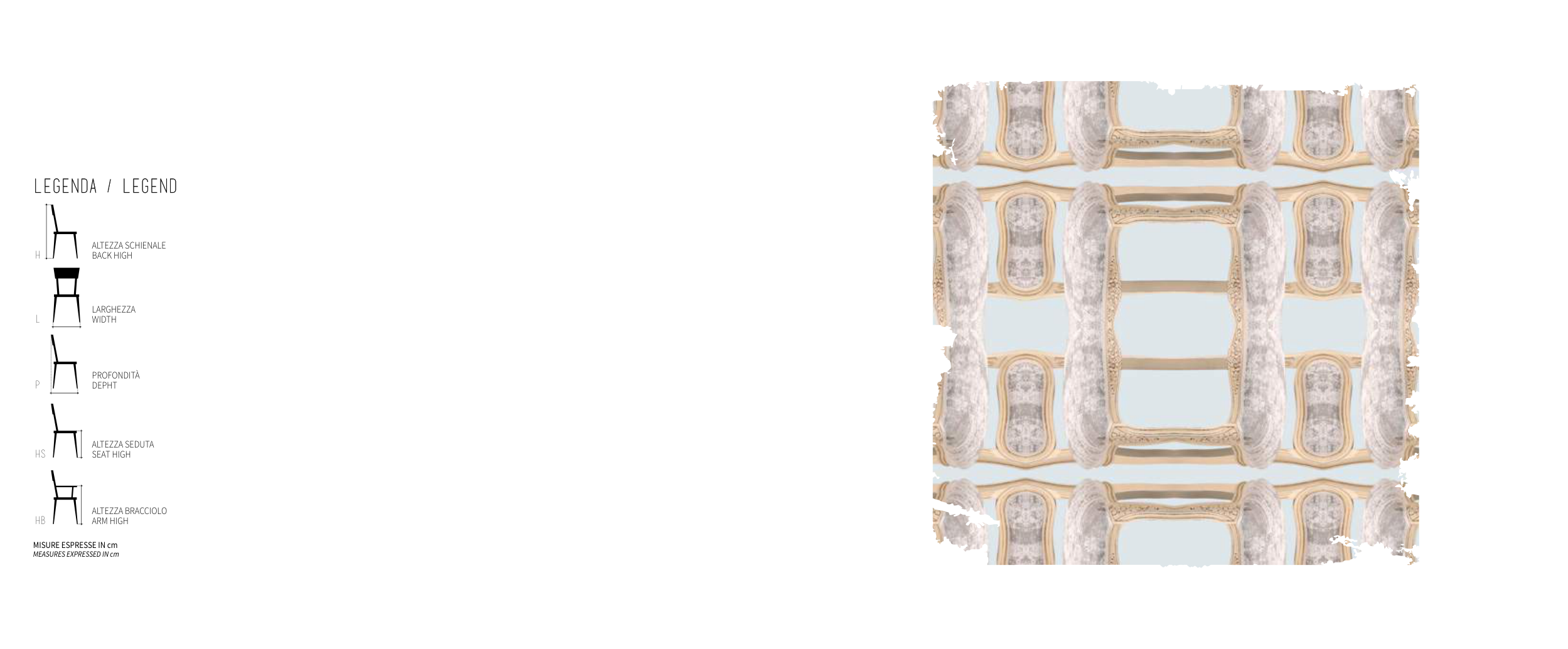 LEGENDA / LEGEND H ALTEZZA SCHIENALE BACK HIGH LARGHEZZA WIDTH PROFONDITÀ DEPHT ALTEZZA SEDUTA SEAT HIGH ALTEZZA BRACCIOLO ARM HIGH L P HS HB MISURE ESPRESSE IN cm mEASURES EXPRESSED IN cm