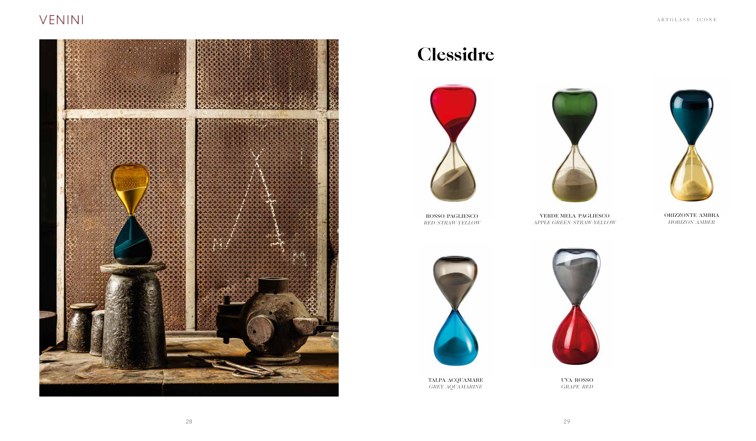 Clessidre ORIZZONTE/AMBRA HORIZON/AMBER TALPA/ACQUAMARE GREY/AQUAMARINE UVA/ROSSO GRAPE/RED ROSSO/PAGLIESCO RED/STRAW-YELLOW VERDE MELA/PAGLIESCO APPLE GREEN/STRAW-YELLOW 28 29 A R T G L A S S | I C O N E