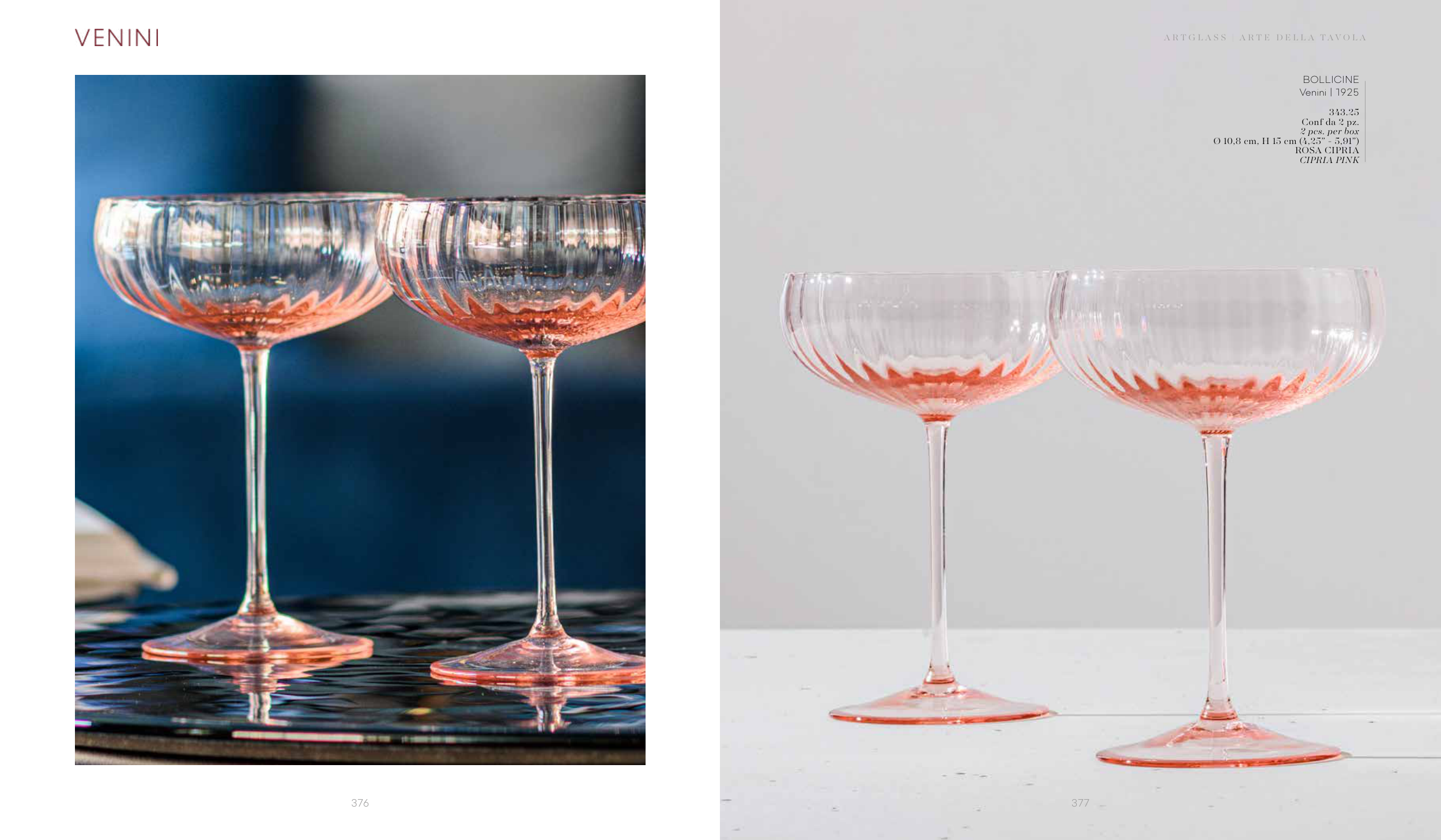 BOLLICINE Venini | 1925 343.25 Conf da 2 pz. 2 pcs. per box Ø 10,8 cm, H 15 cm (4,25” - 5,91”) ROSA CIPRIA CIPRIA PINK 376 377 A R T G L A S S | A R T E D E L L A T A V O L A