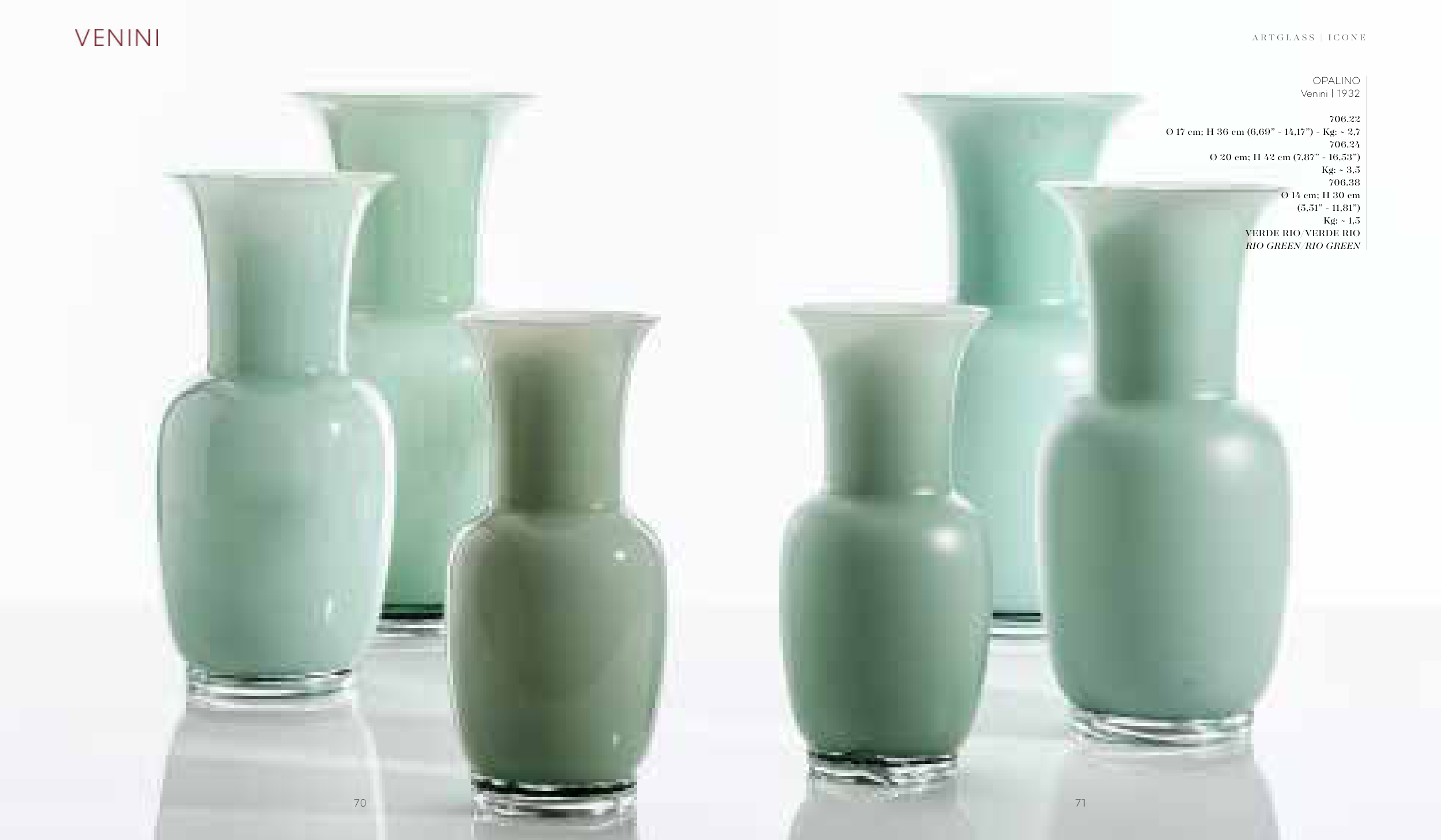 OPALINO Venini | 1932 706.22 Ø 17 cm; H 36 cm (6,69” - 14,17”) - Kg: ~ 2,7 706.24 Ø 20 cm; H 42 cm (7,87” - 16,53”) Kg: ~ 3,5 706.38 Ø 14 cm; H 30 cm (5,51” - 11,81”) Kg: ~ 1,5 VERDE RIO/VERDE RIO RIO GREEN/RIO GREEN 70 71 A R T G L A S S | I C O N E