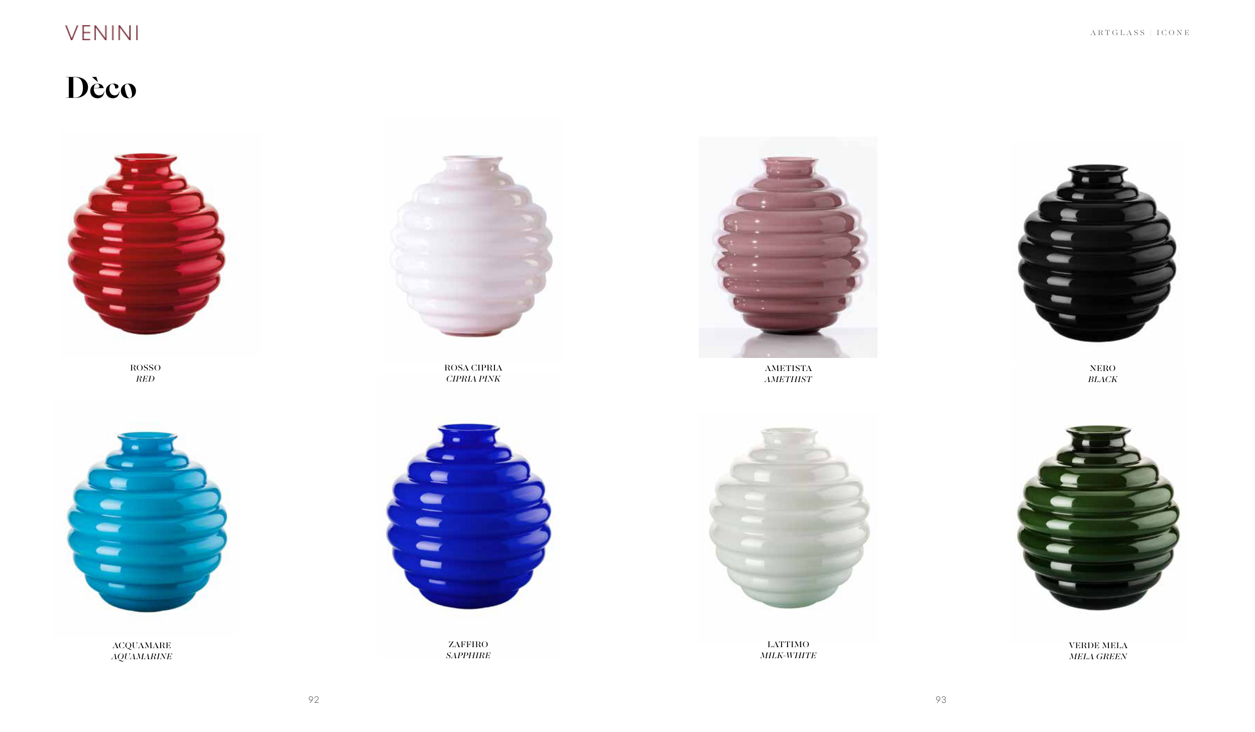 Dèco ROSSO RED ROSA CIPRIA CIPRIA PINK ACQUAMARE AQUAMARINE ZAFFIRO SAPPHIRE AMETISTA AMETHIST NERO BLACK LATTIMO MILK-WHITE VERDE MELA MELA GREEN 92 93 A R T G L A S S | I C O N E