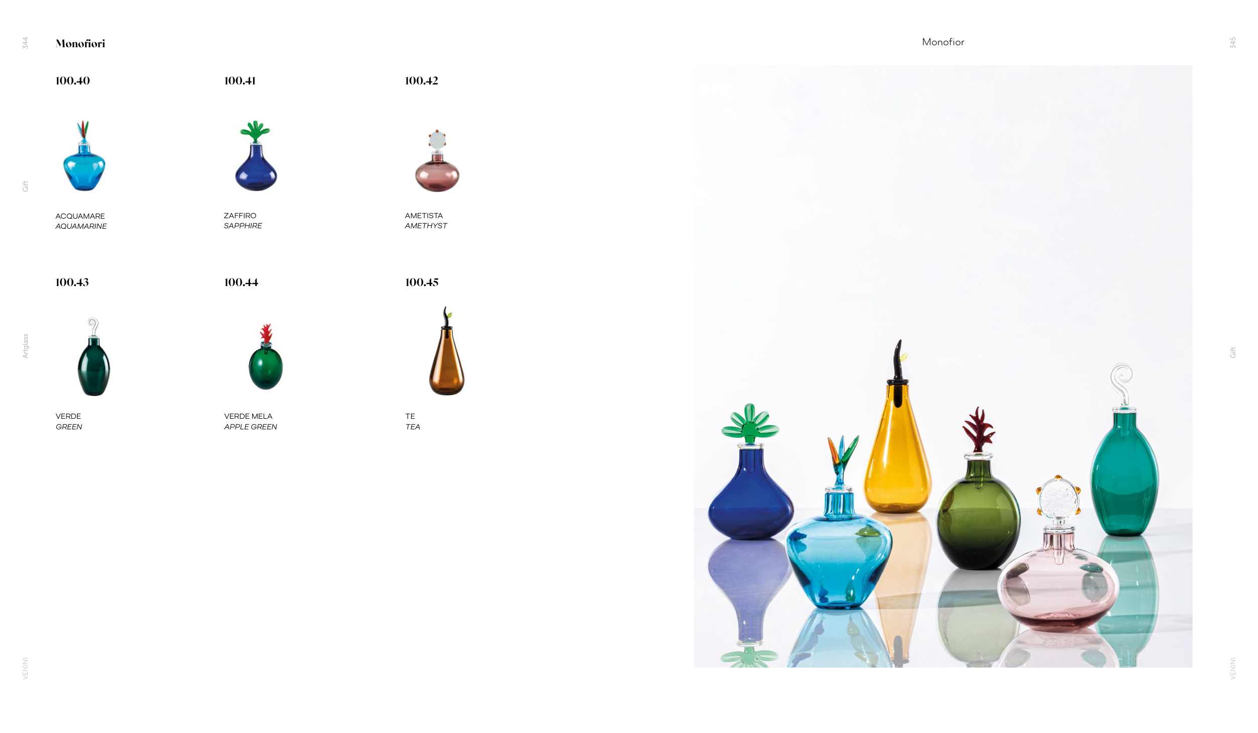 Gift Artglass 344 VENINI Monofiori 100.40 100.43 100.41 100.44 100.45 100.42 ACQUAMARE AQUAMARINE ZAFFIRO SAPPHIRE AMETISTA AMETHYST VERDE GREEN VERDE MELA APPLE GREEN TE TEA Gift 345