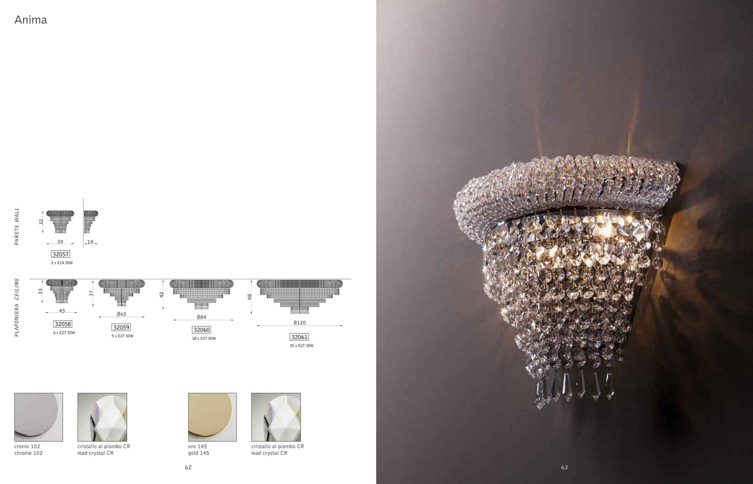 Anima cromo 102 chrome 102 oro 145 gold 145 cristallo al piombo CR lead crystal CR cristallo al piombo CR lead crystal CR 32057 32058 32059 32060 32061 2 x E14 30W 6 x E27 30W 9 x E27 30W 18 x E27 30W 30 x E27 30W 63 62