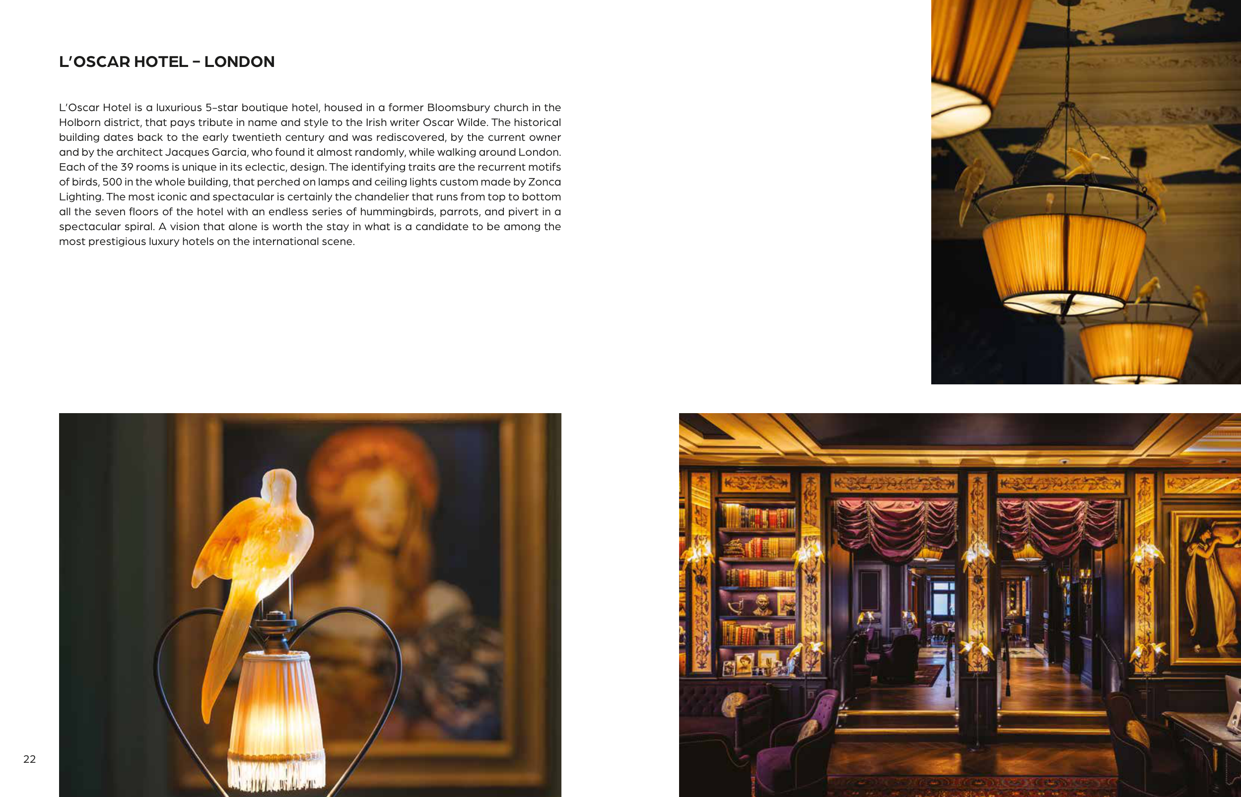 of birds, 500 in the whole building, that perched on lamps and ceiling lights custom made by Zonca