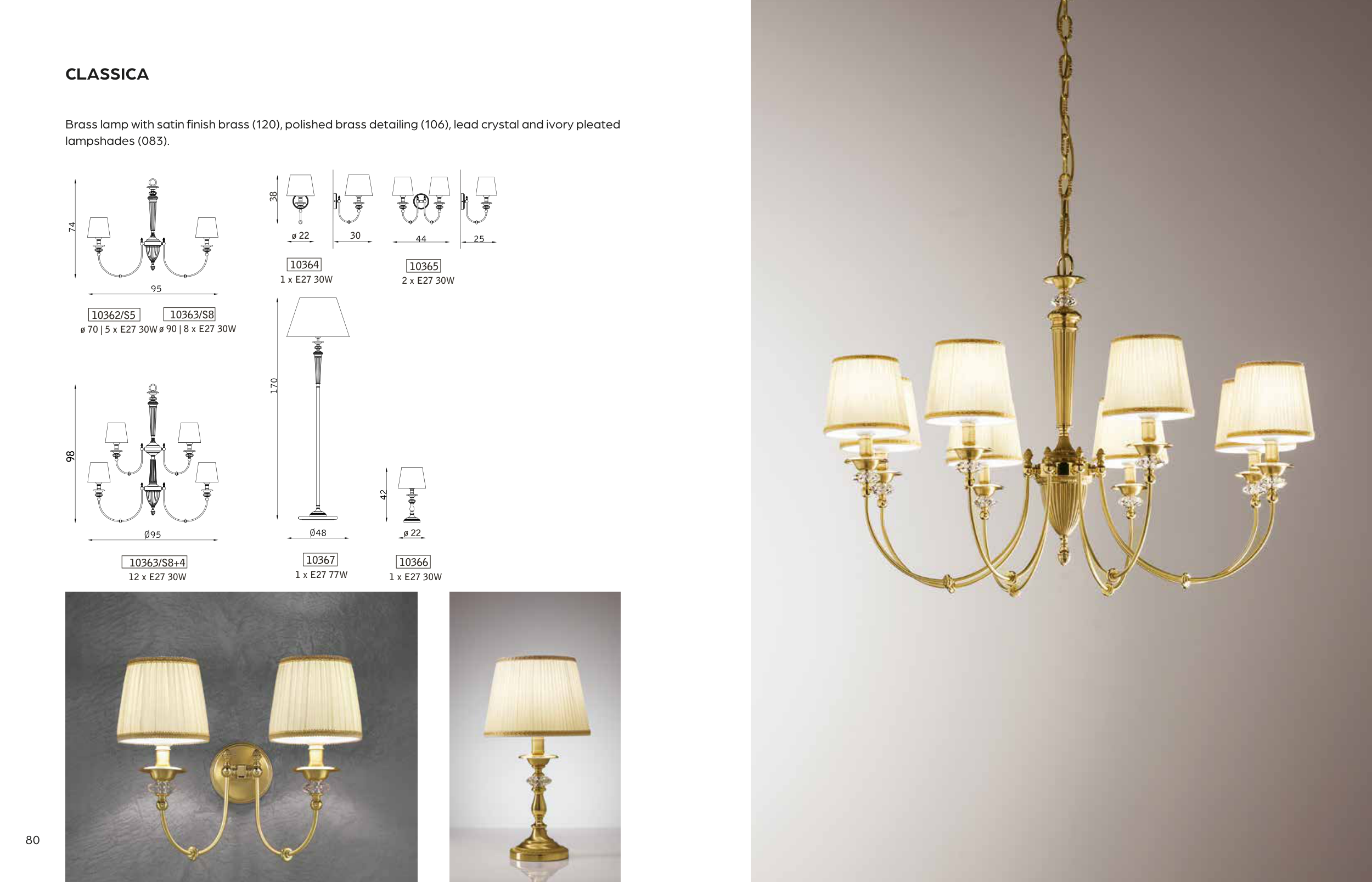Brass lamp with satin finish brass (120), polished brass detailing (106), lead crystal and ivory pleated