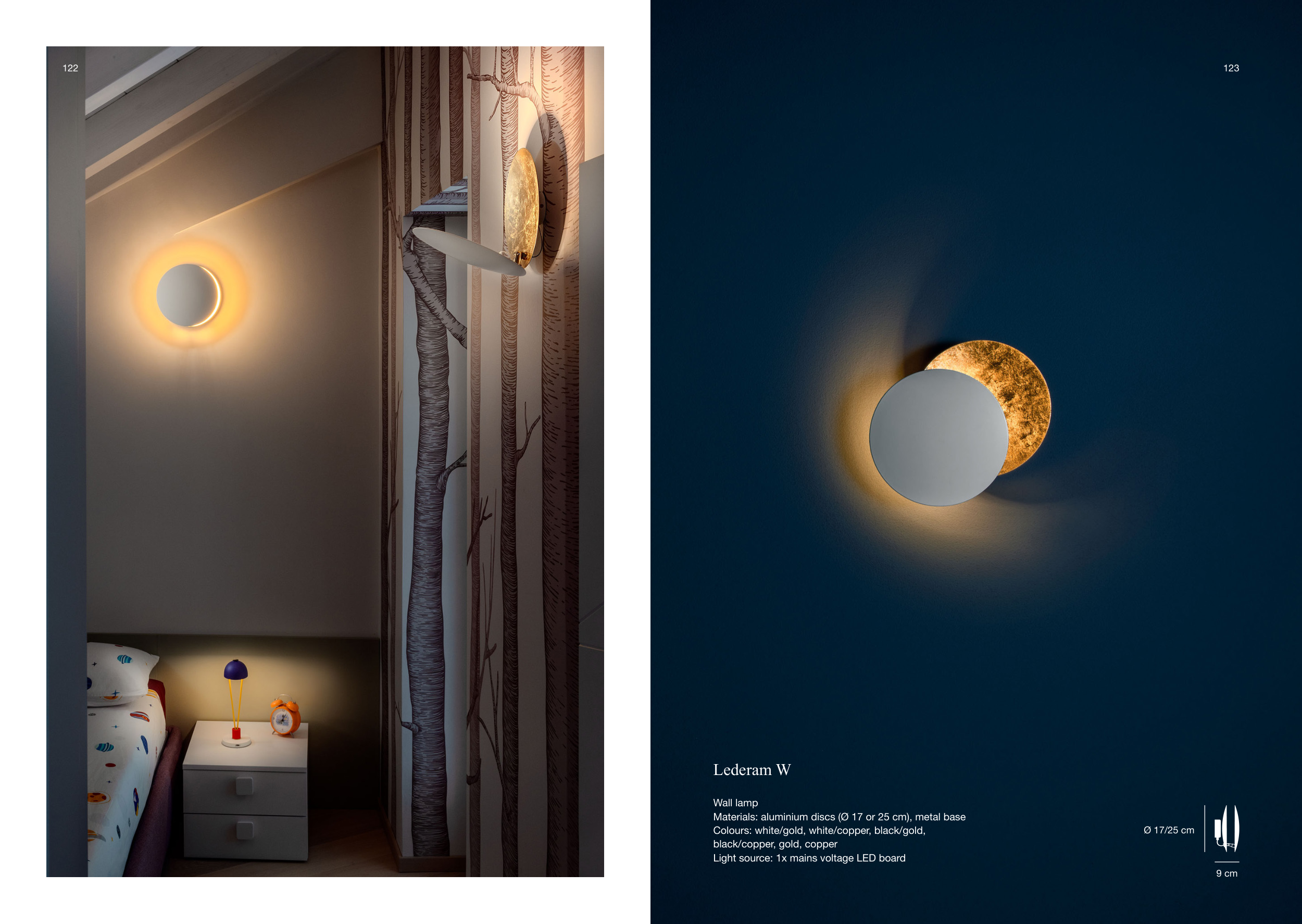 9 cm Ø 17/25 cm 123 122 ?4*4("!)D Wall lamp Materials: aluminium discs (Ø 17 or 25 cm), metal base Colours: white/gold, white/copper, black/gold, black/copper, gold, copper Light source: 1x mains voltage LED board