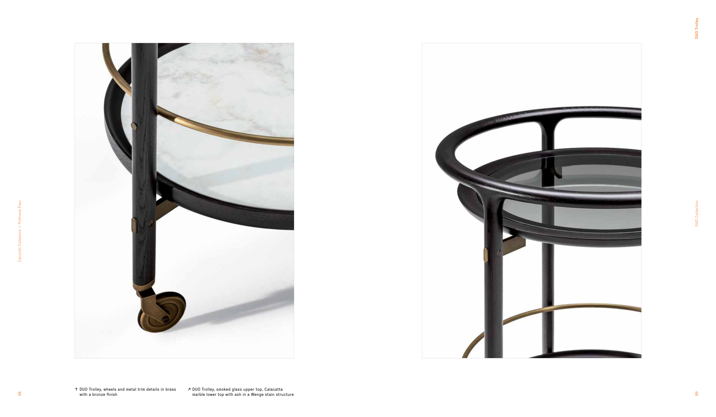 DUO Trolley 99 DUO Collection 98 Ceccotti Collezioni + Poltrona Frau ↗ DUO Trolley, smoked glass upper top, Calacatta marble lower top with ash in a Wenge stain structure ↑ DUO Trolley, wheels and metal trim details in brass with a bronze finish
