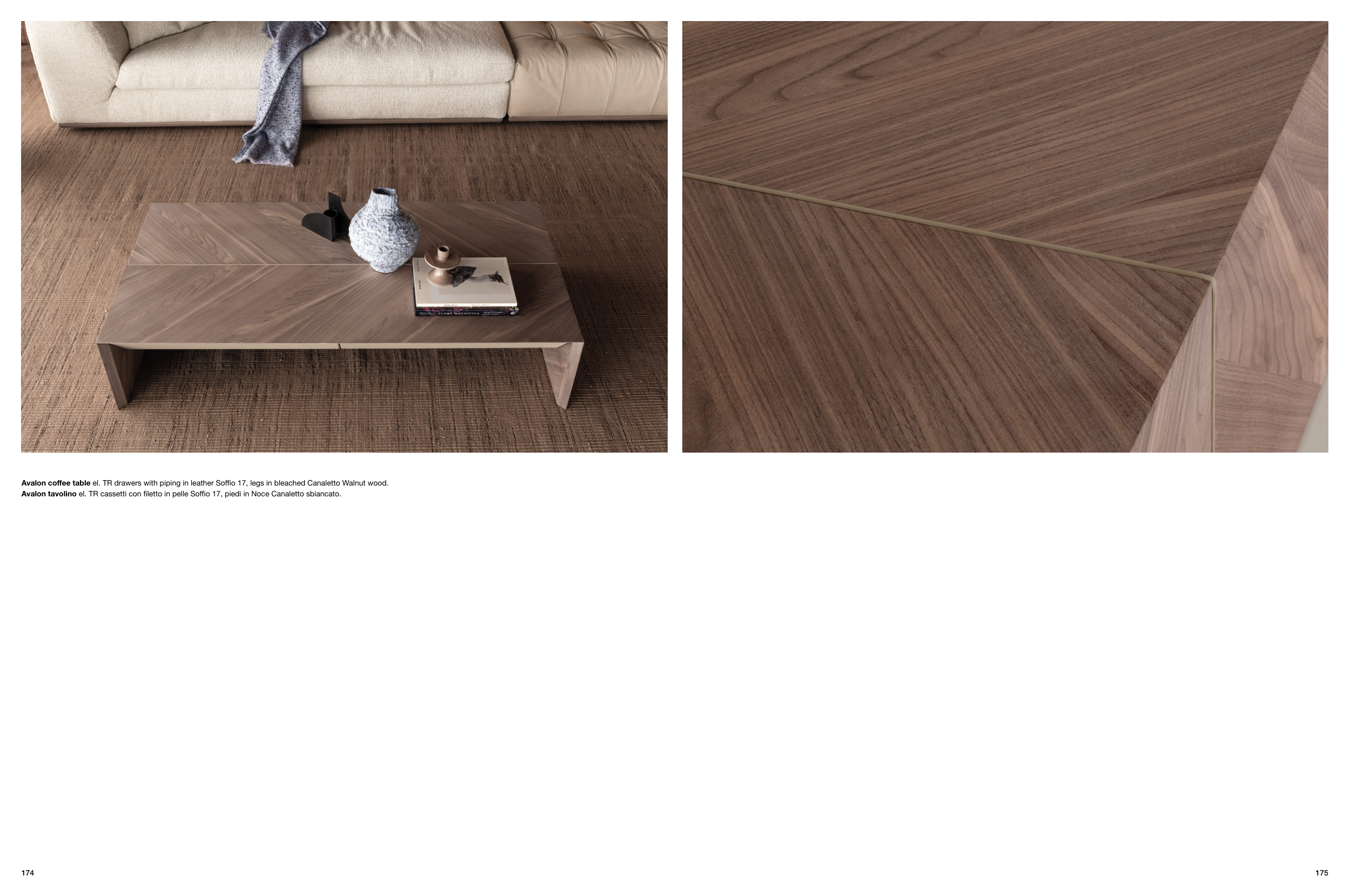 Avalon coffee table el. TR drawers with piping in leather Soffio 17, legs in bleached Canaletto Walnut wood. Avalon tavolino el. TR cassetti con filetto in pelle Soffio 17, piedi in Noce Canaletto sbiancato. 175 174