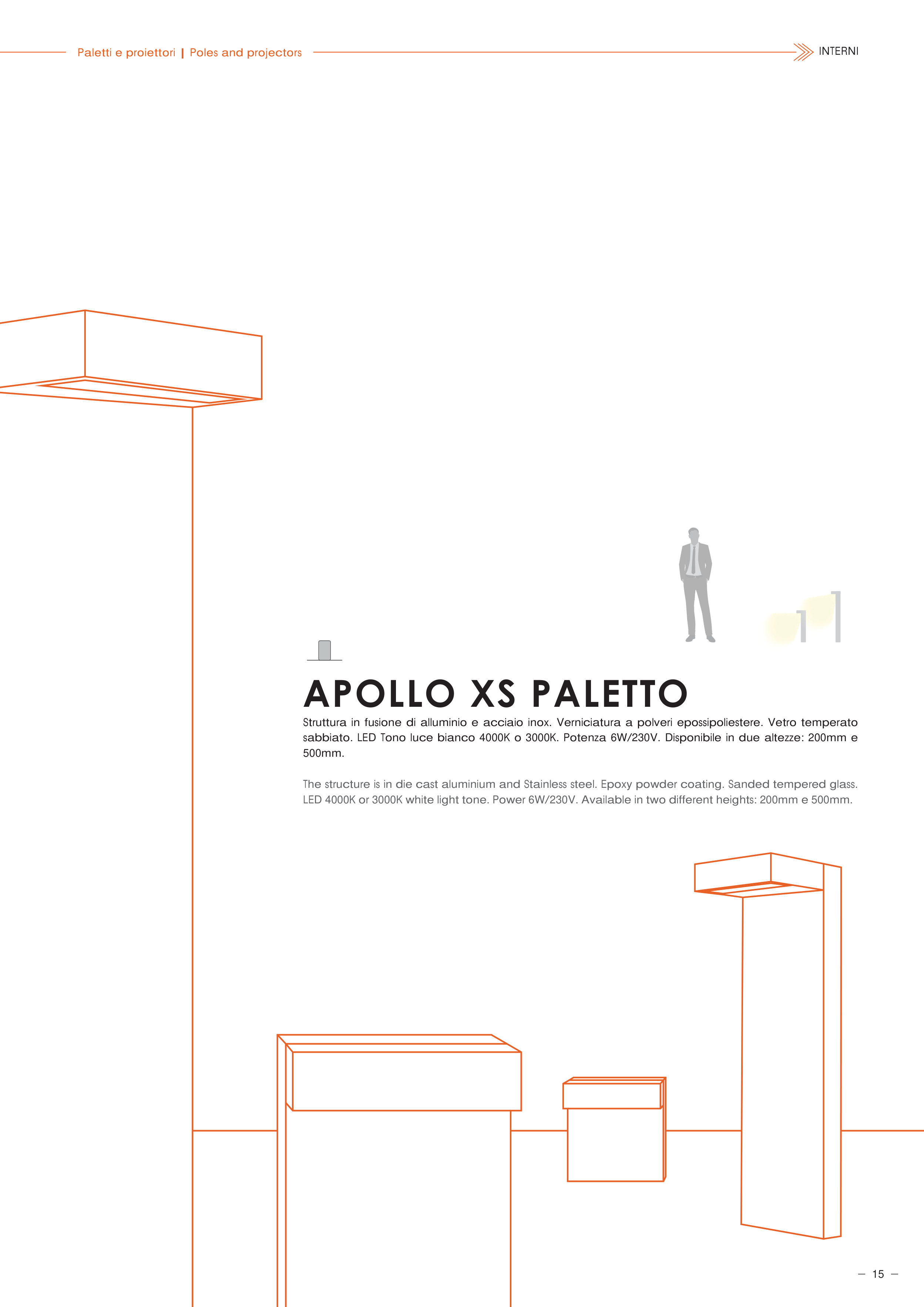 LED 4000K or 3000K white light tone. Power 6W/230V. Available in two different heights: 200mm e 500mm.
