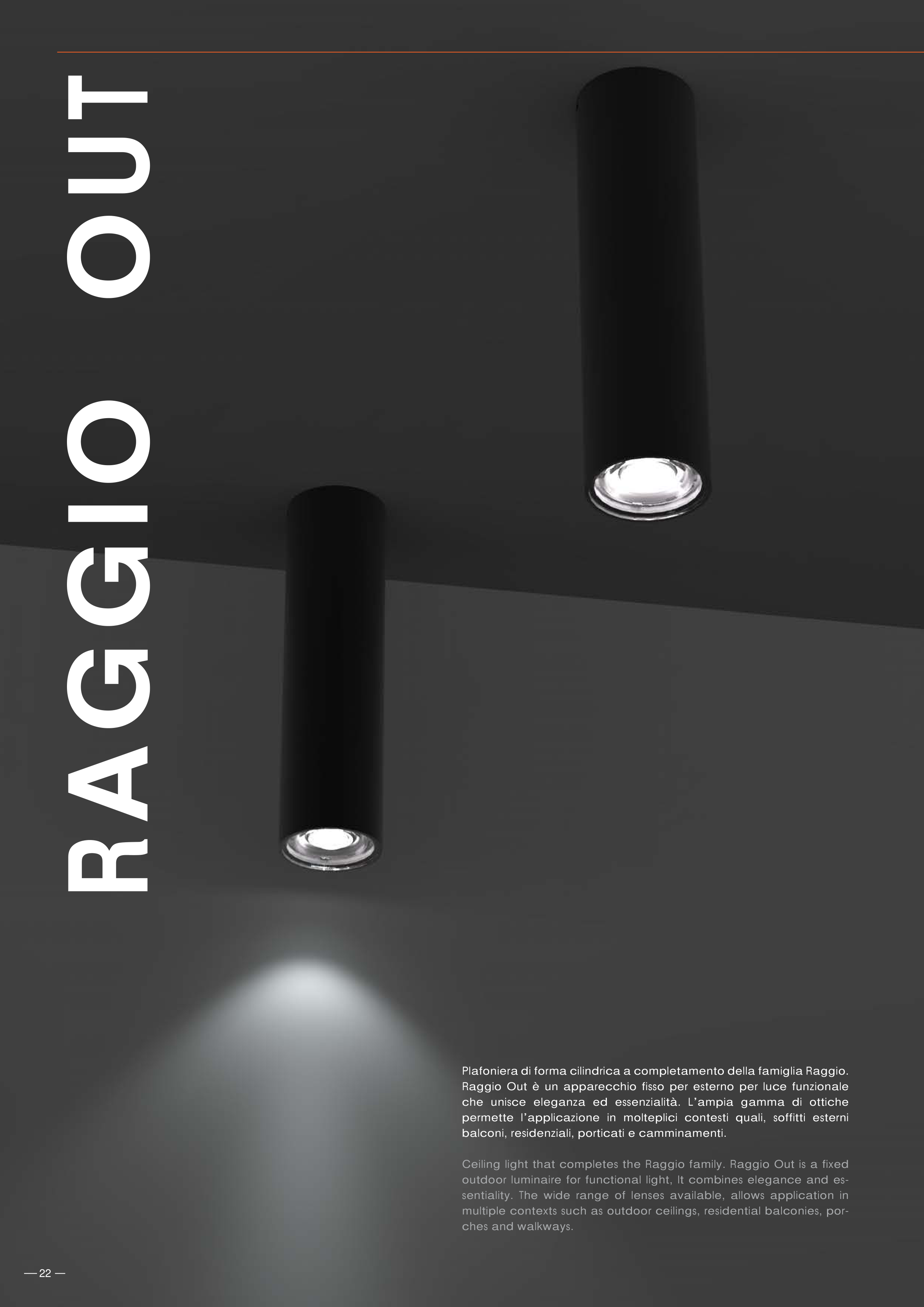 Ceiling light that completes the Raggio family. Raggio Out is a fixed