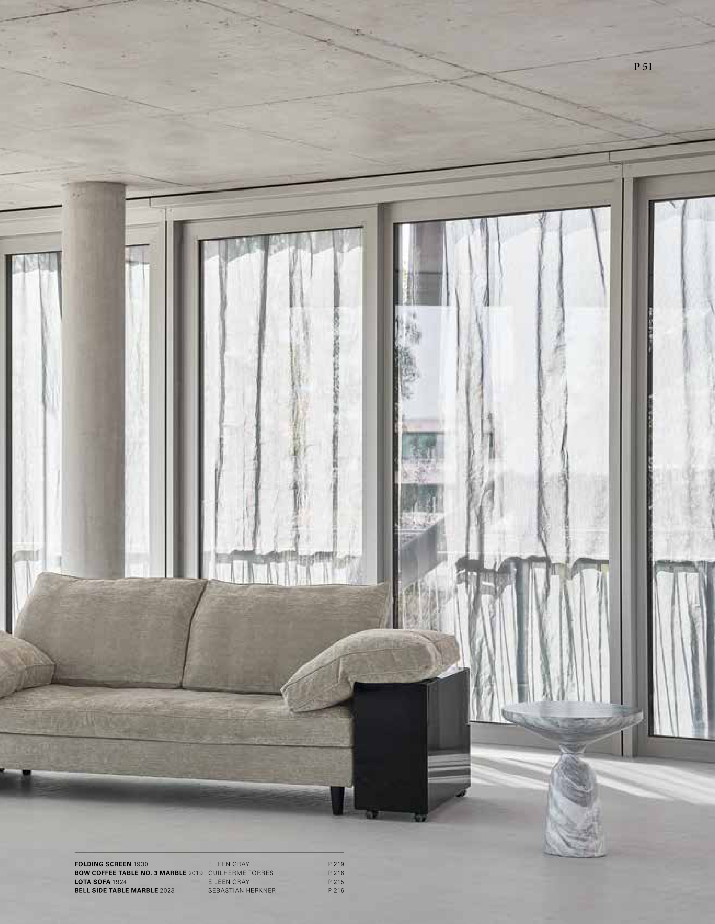 FOLDING SCREEN 1930 EILEEN GRAY P 219 BOW COFFEE TABLE NO. 3 MARBLE 2019 GUILHERME TORRES P 216 LOTA SOFA 1924 EILEEN GRAY P 215 BELL SIDE TABLE MARBLE 2023 SEBASTIAN HERKNER P 216 P 51