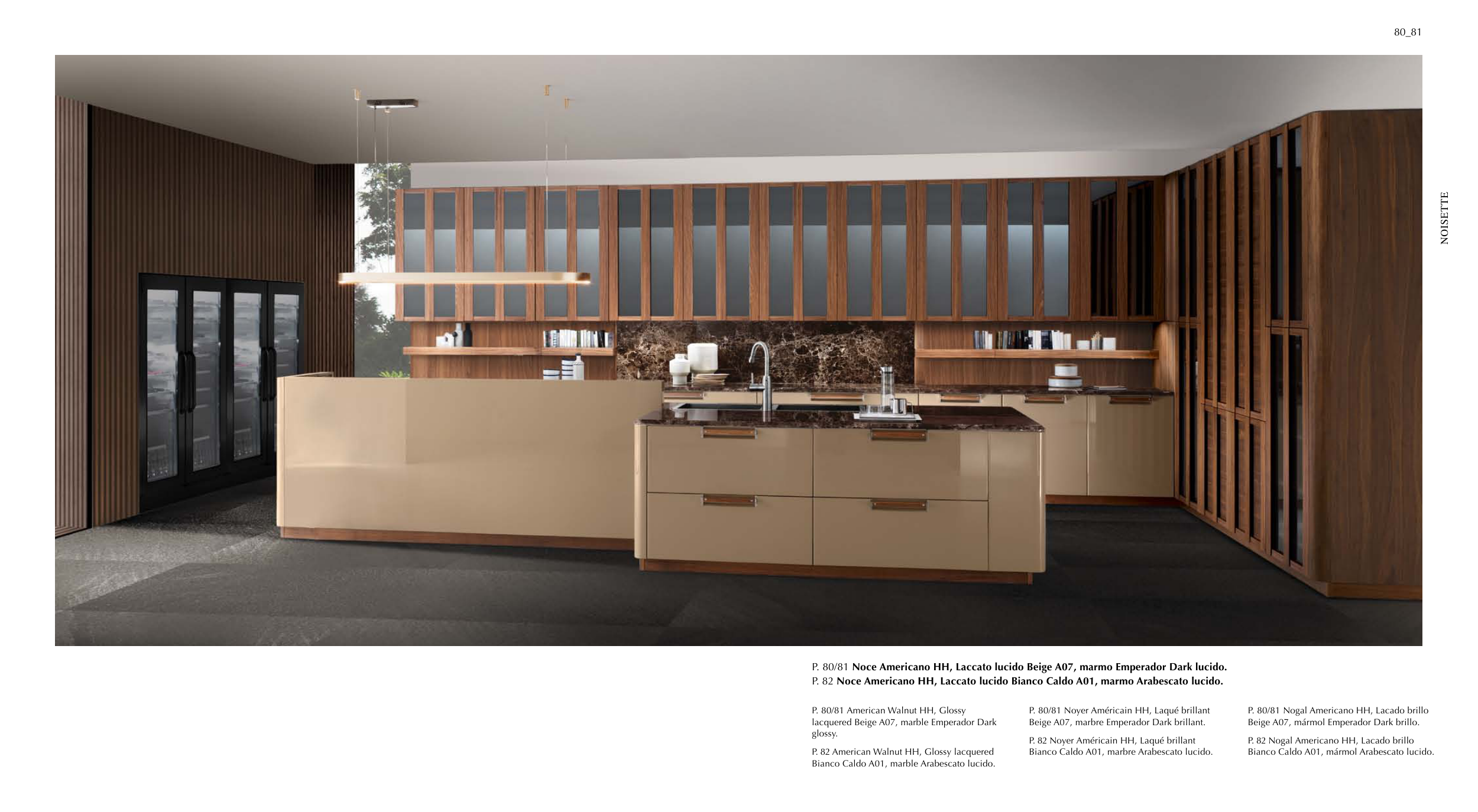 P. 80/81 Noce Americano HH, Laccato lucido Beige A07, marmo Emperador Dark lucido.
