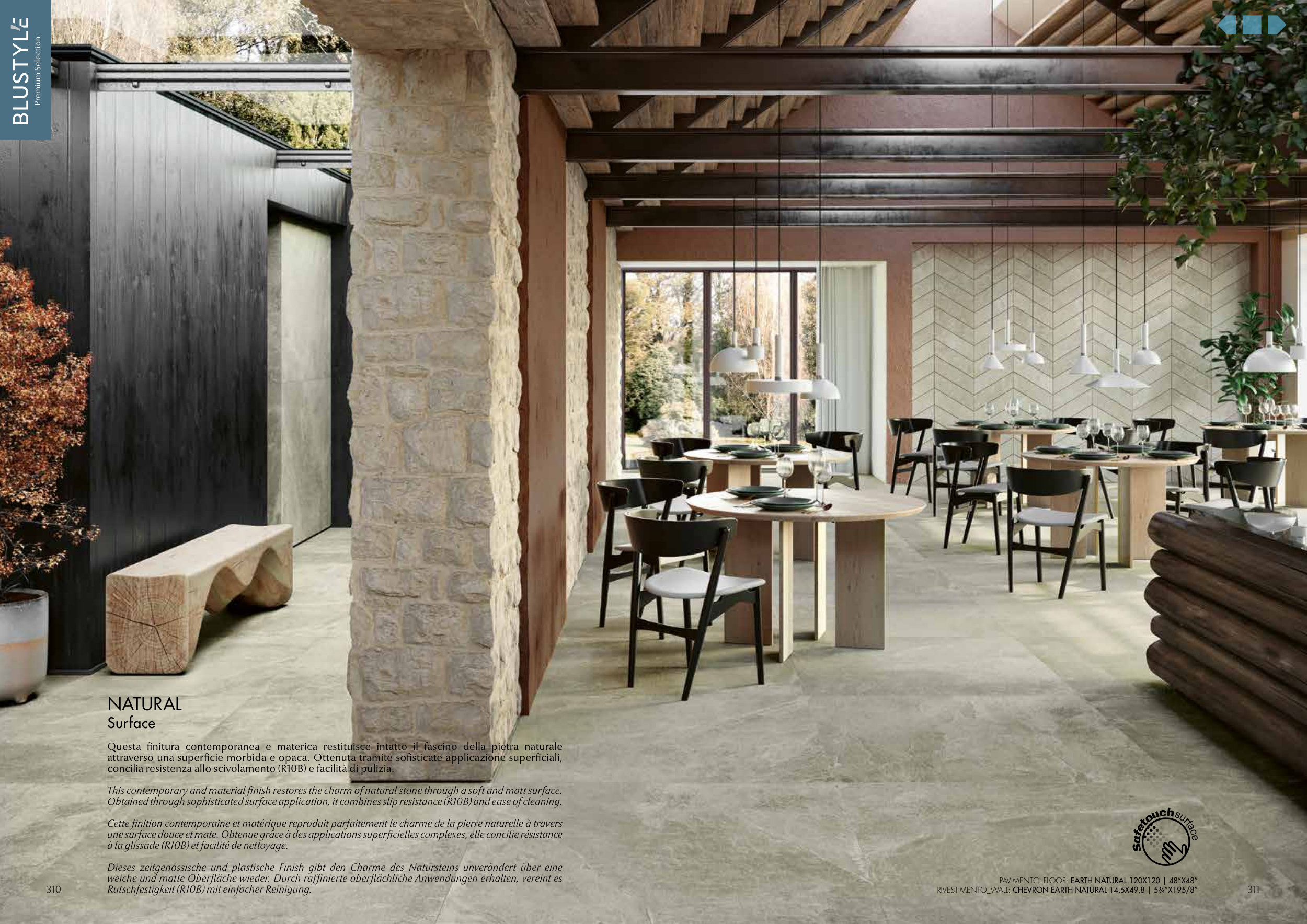 This contemporary and material finish restores the charm of natural stone through a soft and matt surface.