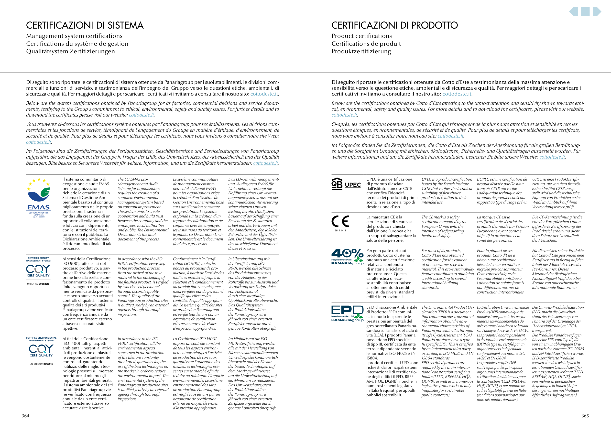 Below are the system certifications obtained by Panariagroup for its factories, commercial divisions and service depart-