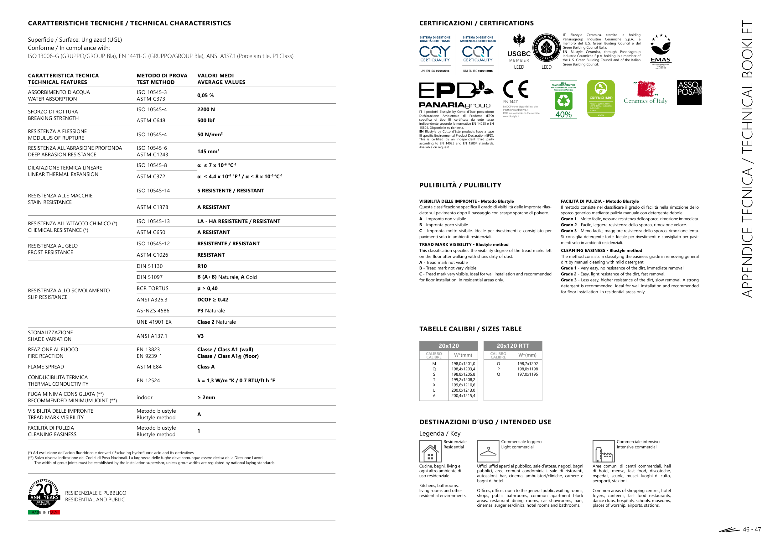 ISO 13006-G (GRUPPO/GROUP Bla), EN 14411-G (GRUPPO/GROUP Bla), ANSI A137.1 (Porcelain tile, P1 Class)