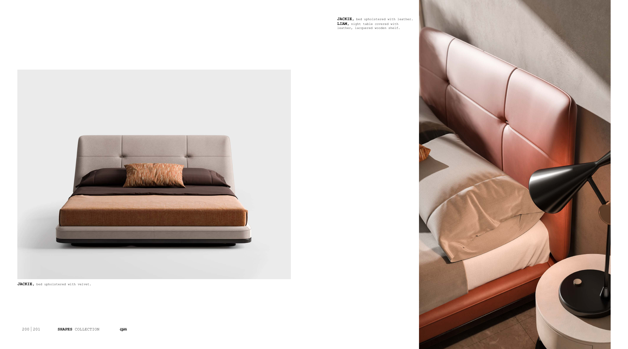 JACKIE, bed upholstered with velvet. JACKIE, bed upholstered with leather. LIAM, night table covered with leather, lacquered wooden shelf. SHAPES COLLECTION 200 201