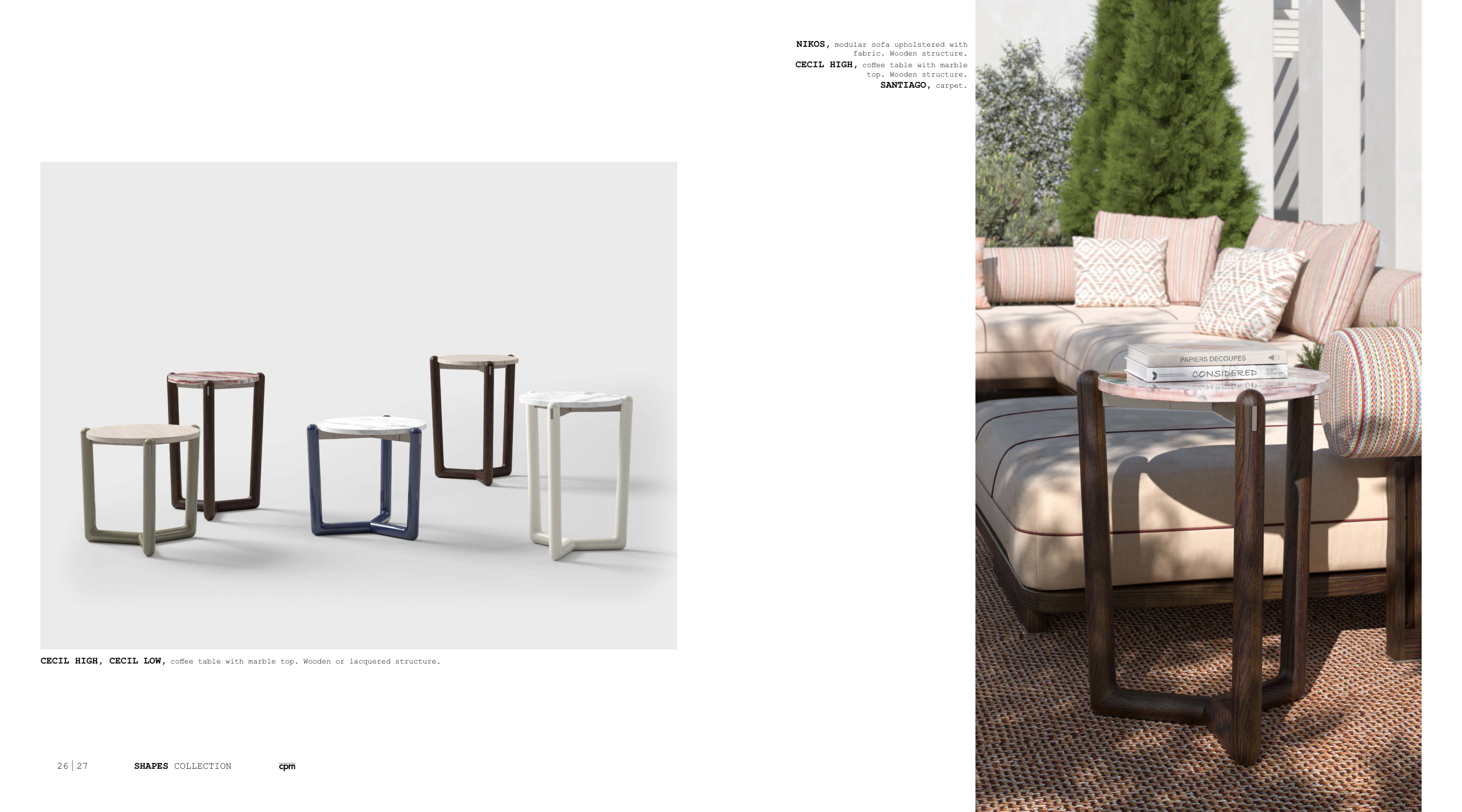 CECIL HIGH, CECIL LOW, coffee table with marble top. Wooden or lacquered structure.