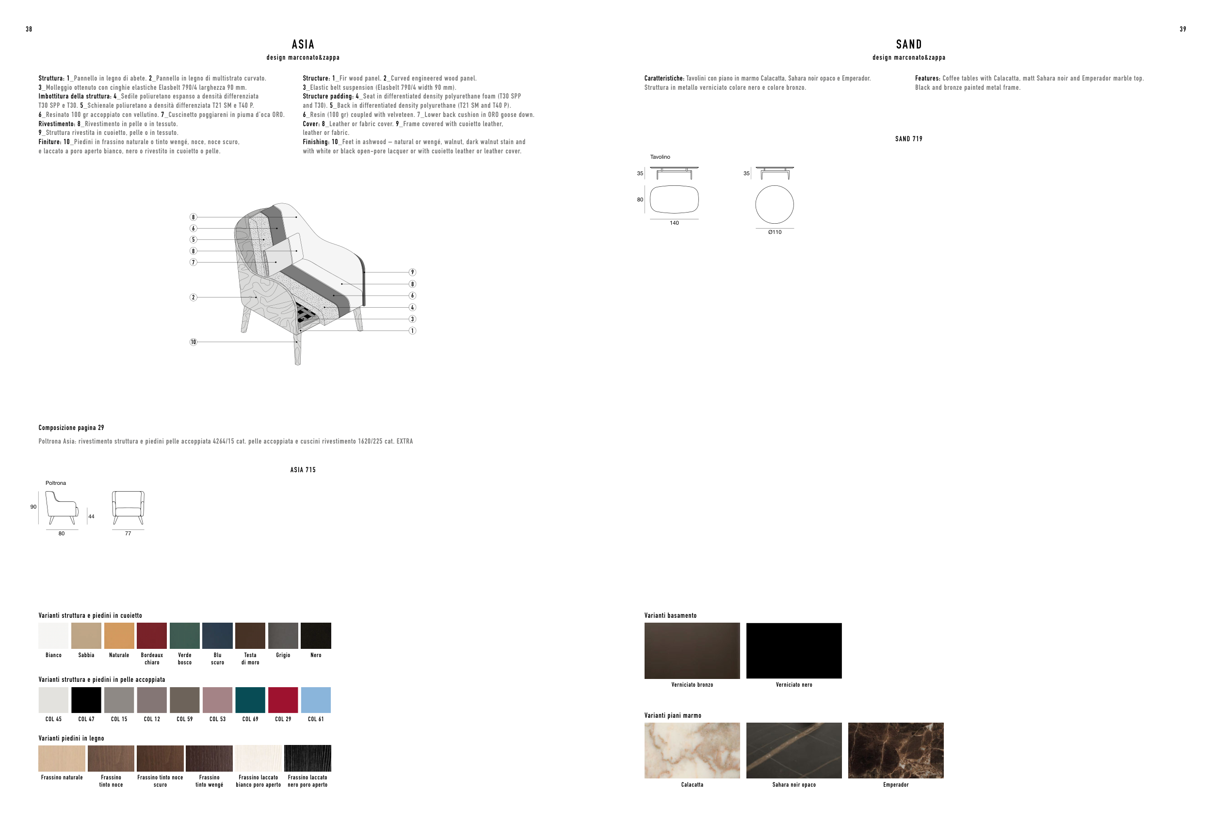 Poltrona Asia: rivestimento struttura e piedini pelle accoppiata 4264/15 cat. pelle accoppiata e cuscini rivestimento 1620/225 cat. EXTRA