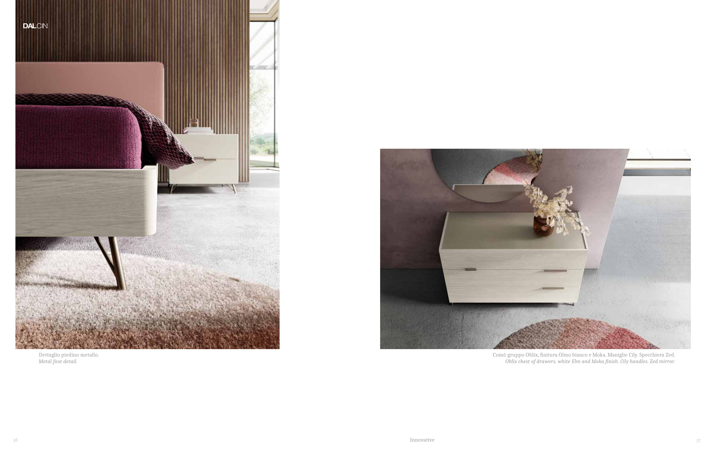 Innovative Comò gruppo Oblix, finitura Olmo bianco e Moka. Maniglie Cily. Specchiera Zed. Oblix chest of drawers, white Elm and Moka finish. Cily handles. Zed mirror. Dettaglio piedino metallo. Metal foot detail. 37 36