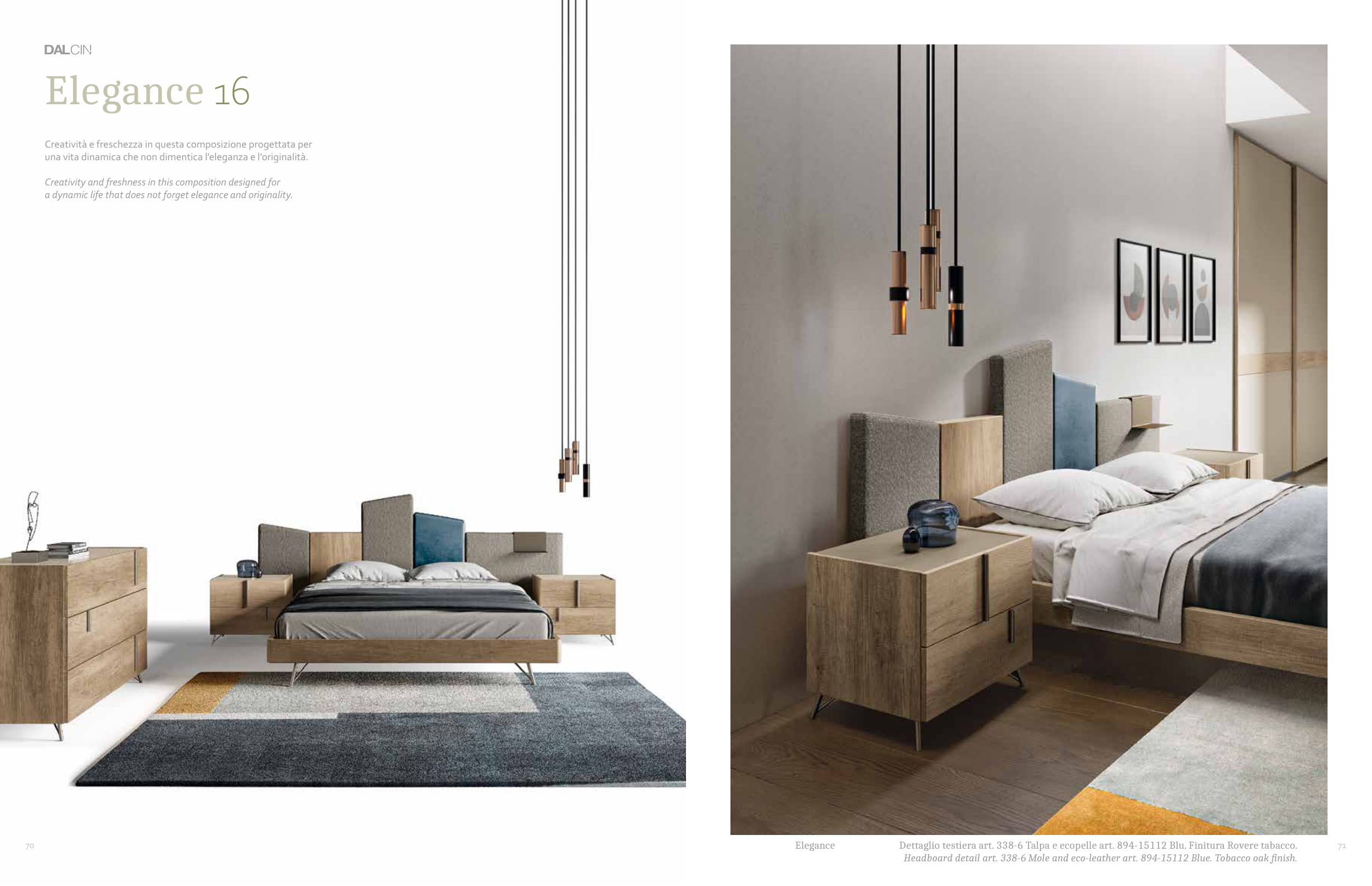 Dettaglio testiera art. 338-6 Talpa e ecopelle art. 894-15112 Blu. Finitura Rovere tabacco.