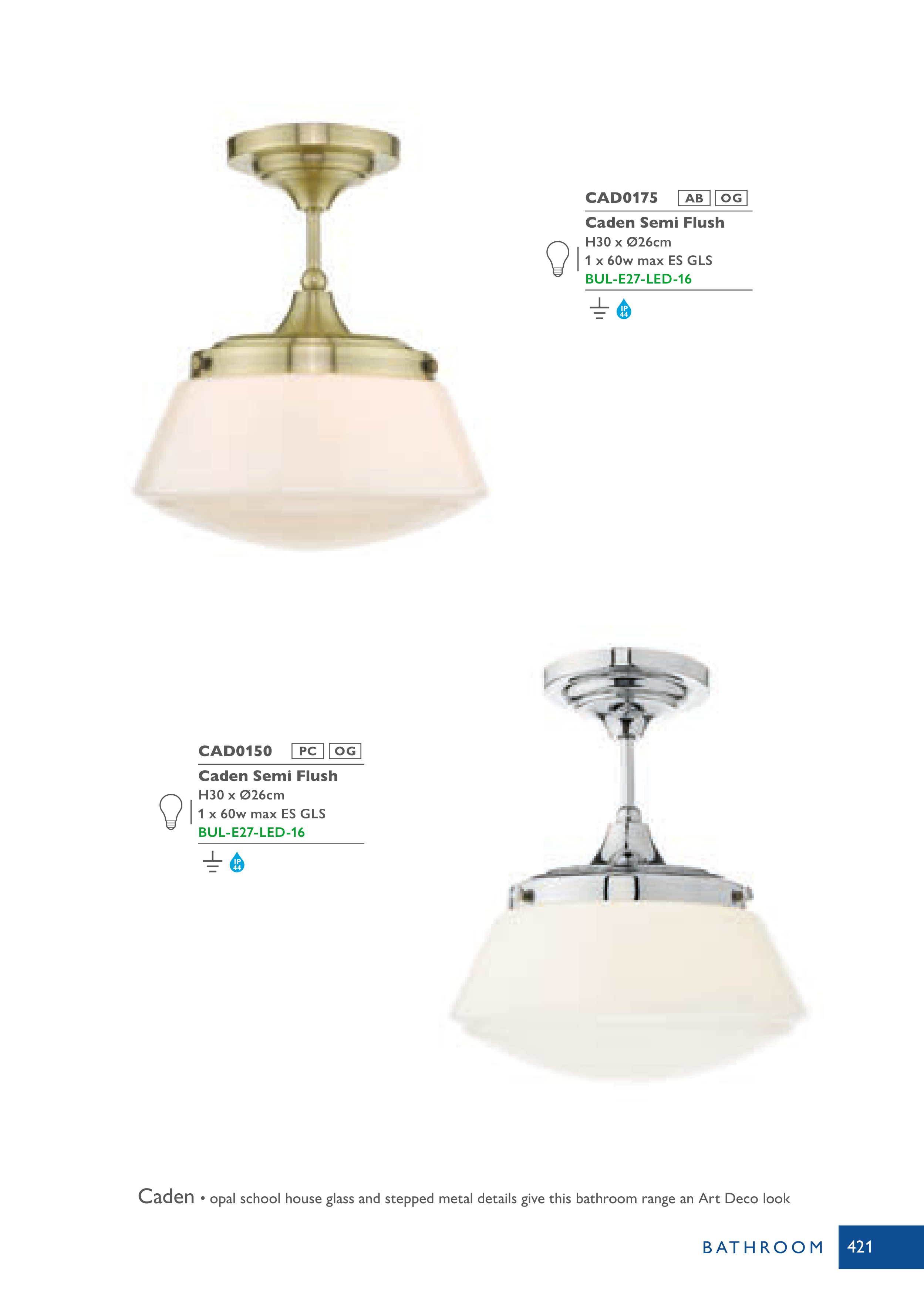 • opal school house glass and stepped metal details give this bathroom range an Art Deco look