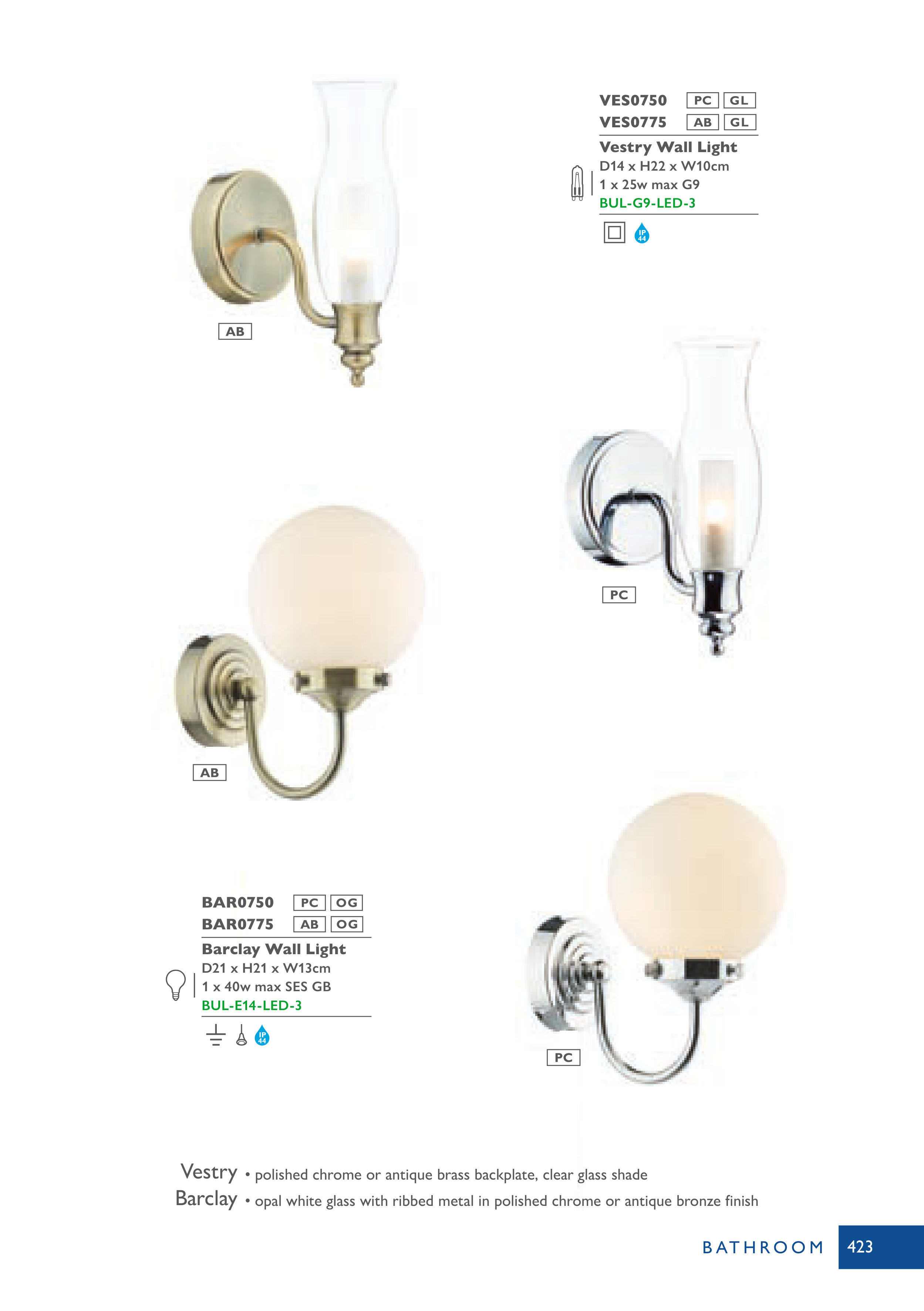 • polished chrome or antique brass backplate, clear glass shade
