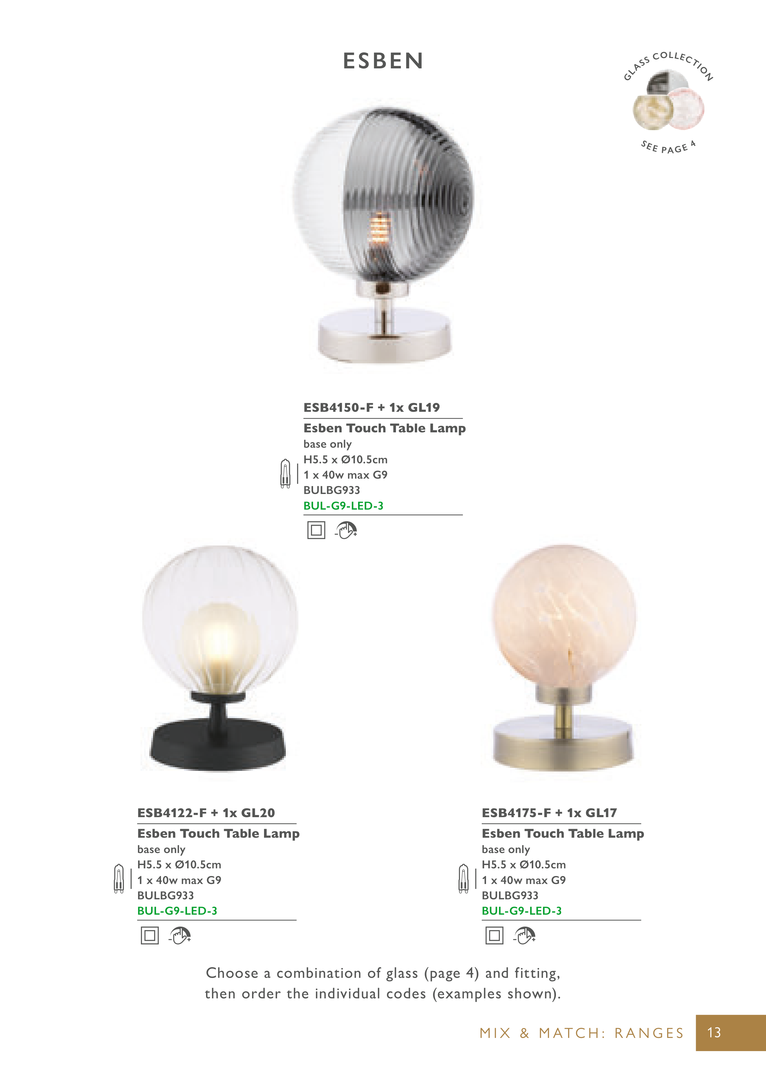Choose a combination of glass (page 4) and fitting,
