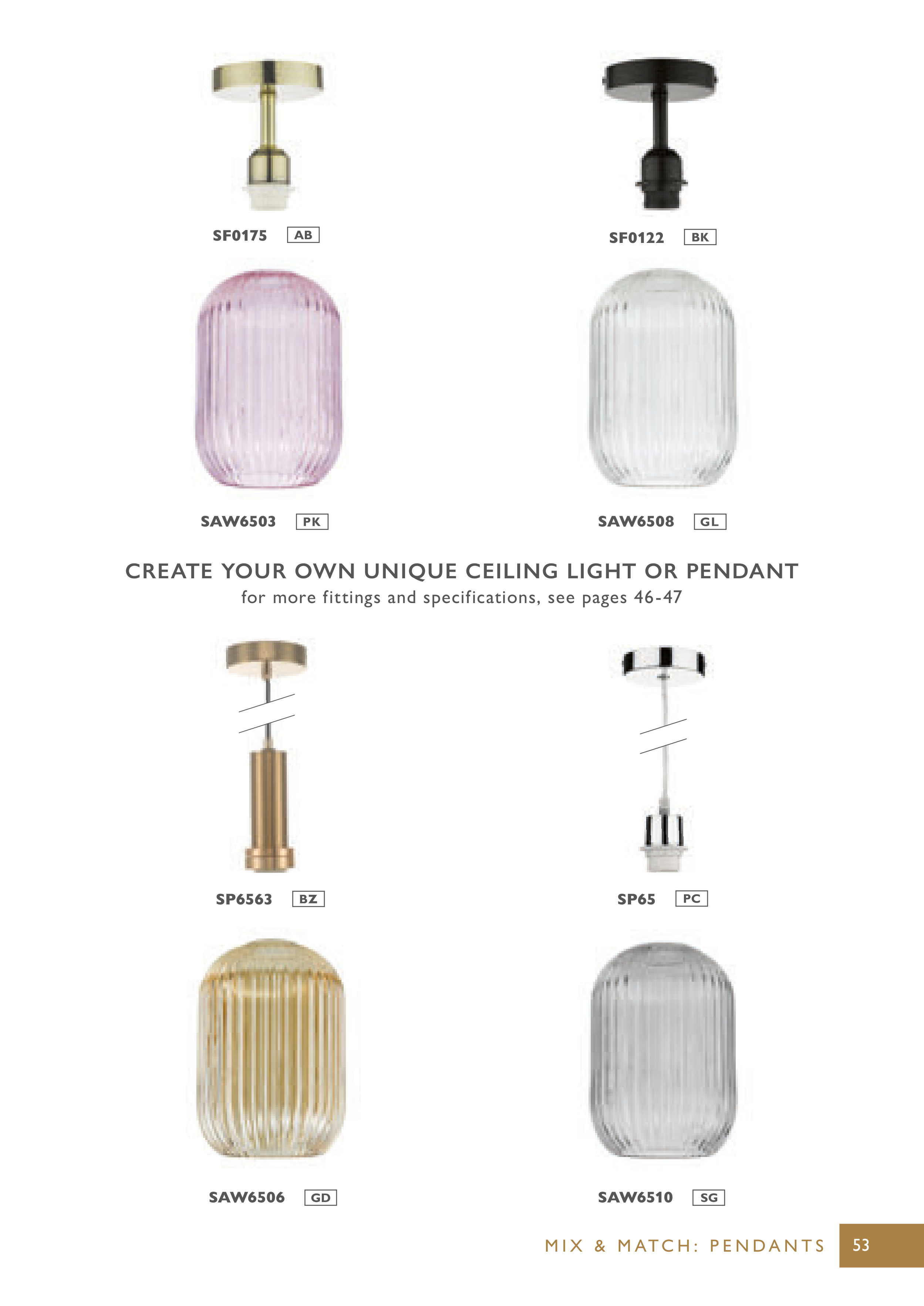 M I X & M AT C H : P E N D A N T S CREATE YOUR OWN UNIQUE CEILING LIGHT OR PENDANT for more fittings and specifications, see pages 46-47 SAW6508 v SAW6510 P SAW6506 u SAW6503 K SF0122 g SF0175 a SP65 J SP6563 l 53